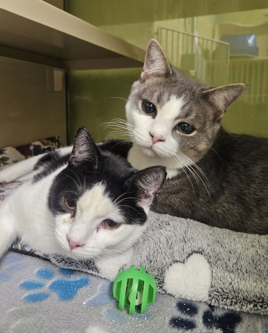 Rocket – Male DOB 3/28/2025 Domestic Short Hair – Black and White Bandit and Rocket are bonded brothers who are happiest when they’re together and will need to go home as a pair. Rocket, dressed in a classic black-and-white coat, lives up to his name… always zooming, racing through the room, and turning everything into a game. If there’s space to run, Rocket will find it. Bandit, with his soft gray-and-white coloring, is also a bit true to his name. He’s more reserved, prefers to take things in before jumping right in, and tends to follow Rocket’s lead. When Rocket is around, Bandit relaxes and feels much more at ease, sticking close and joining the fun once he knows everything’s okay. We often see Rocket charging ahead while Bandit watches for a moment, then follows along. These boys would do best in a home without dogs, as Bandit is more sensitive, and with older, respectful children. They’d love a home with room to run, play, and burn off Rocket’s energy, while Bandit keeps an eye on things at his own pace. Please apply via our easy online application at https://furrr.org/cat-adoption-process/All kitten(s) and cat(s) at FuRRR Feline Rescue are spayed/neutered, up to date on vaccinations for their age, combo tested for FIV/FeLV, microchipped and have a Health Certificate from a licensed NH veterinarian. Our application is available to be completed online at https://furrr.org/cat-adoption-process/ Applying DOES NOT guarantee approval. We hold meet and greets with approved applications only. (Kittens are available for adoption in pairs only unless they are going home to another kitten or young cat under 3) Our policy is strictly NO DECLAWING and INDOOR ONLY. Adoption fees: Kitten to 1 yr – $300 Kitten pairs $550 Adult cat 1+ yr to 8 yr – $200 Adult pairs $350 Cat 8+ – $75