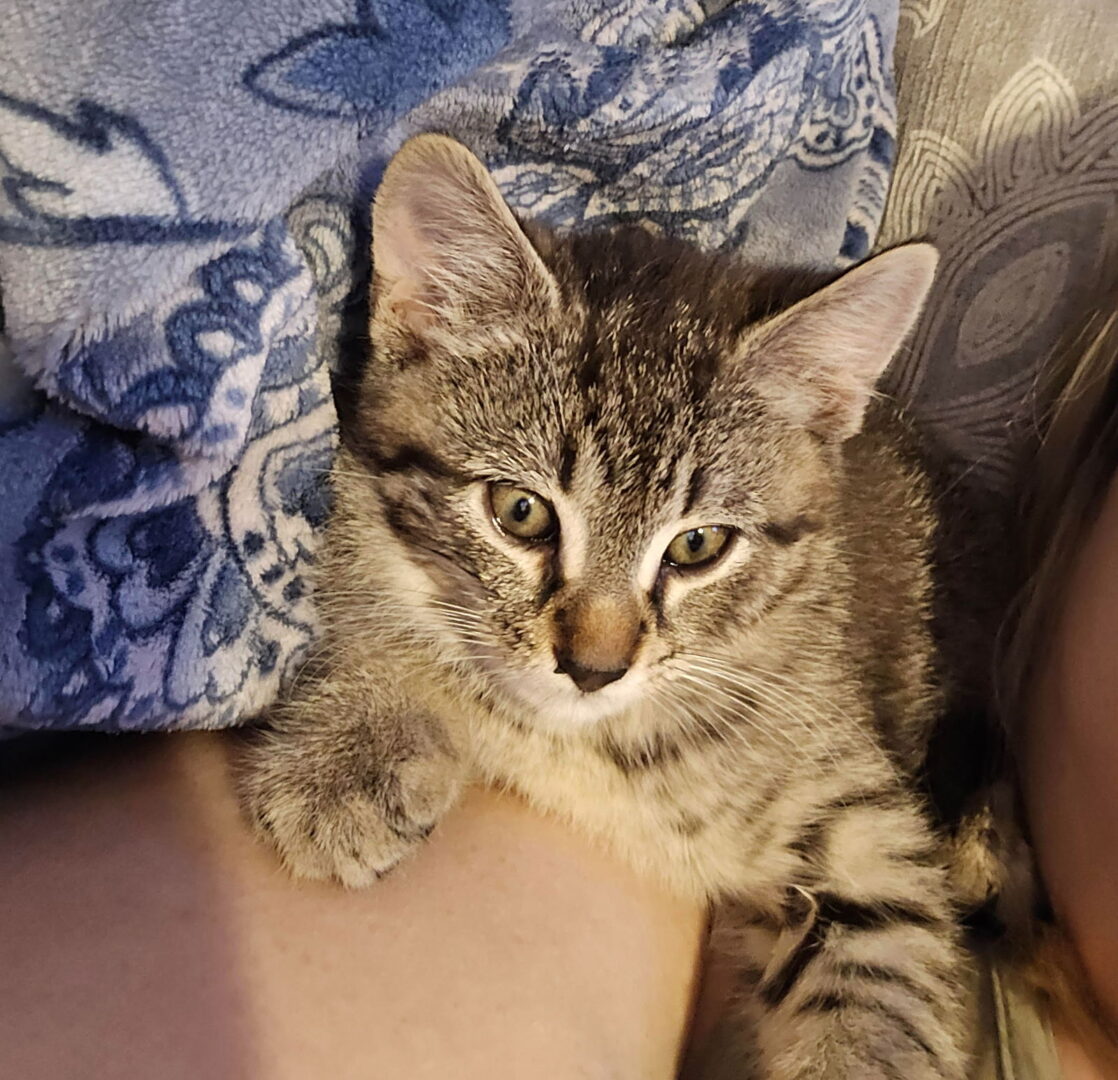 Kid- and Cat-Friendly!! Rocket is a 2 month old, male, Tabby, born around 10/25/24. He is the biggest of the litter of 5, at 2bs. 9oz. on 01/02/2025. He loves snuggling with humans, playing with balls, and running around with his siblings. Rocket is a sweet boy who’s good with kids and other cats. He’s been sterilized and is up to date on shots. Rocket is also litter box trained. Rocket would love to find a new home with one or more of his siblings (Yuri, Fuzzy Butt, and Thor). The kittens’ mom Mia (FCID# 10/30/2024 – 7) is looking for her forever home, too. Please submit our no-obligation Adoption Application for a meet and greet or to adopt: https://forgottencats.org/adoption-application/. Thank you! (Foster: Andrea S.)