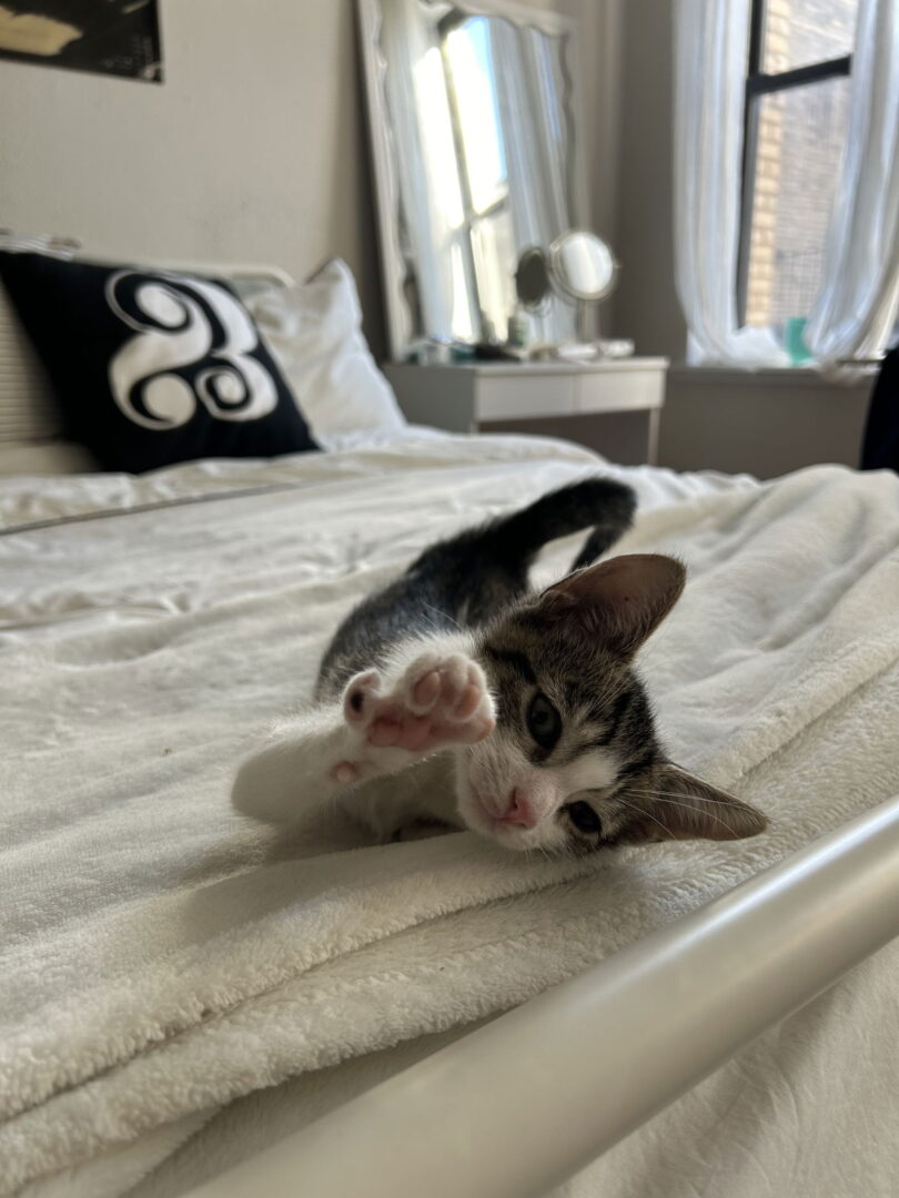 Meet Rocky! She’s a 12-week-old kitten with *tons* of kitten energy. Rocky is a really high-energy little girl and needs someone with a young kitty who’s willing to play with her — a lot! While she can snuggle and relax, most of the time she likes to play. She can run around for hours chasing her feather toy, or just running laps around the room. That said, she loves to curl up with her person at night and conk out after a day of being totally bananas. Rocky is up-to-date on vaccines, microchipped, tested negative for FIV/FeLV, and will be spayed when she’s old enough. Rocky is a young kitten and MUST be adopted to a home with another young, playful cat. Applications for Rocky as a solo cat will not be considered. If you’re interested in this cutie, fill out an application at www.brooklynanimalaction.org/adoption-forms and designate Jennie AnneS as the rescuer. Thank you for your interest in a rescued kitty! All adoption fees and donations go to saving the next sweetie.