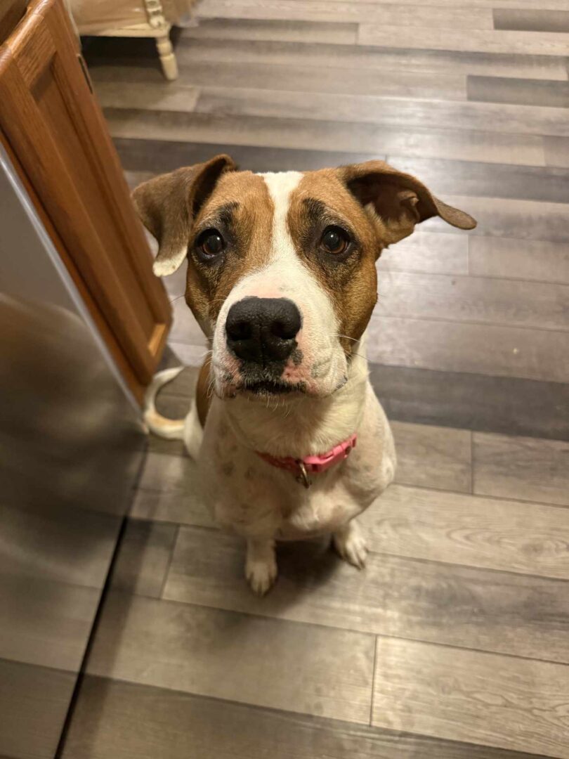 Sadie is an approximate 3-year-old, female, possible Hound/Terrier mix. She is a local owner surrender that ended up pregnant last fall and gave birth to 10 puppies. Hope was able to secure 8 of her puppies before bringing Sadie into rescue as well. Sadie weighs about 55 lbs. and is house trained. This girl loves to snuggle and sleep under blankets! She can be a bit slow to warm up to new people but once she does, she is your best friend. She seems to warm up quicker to men. Sadie has been with large dogs and small dogs and has done well. She is also being fostered with cats and gives them the space they need and has no issues. Sadie is a bit under socialized, so she is learning trust in her foster home. She enjoys having conversations with people and telling you what she thinks. It's pretty cute! Sadie is looking for an active family that will give her time to adjust and work on her basic commands. She has wonderful potential! If you are interested in meeting Sadie, please complete an online application at https://hopeanimalrescueofiowa.duplie.com/forms/196/dog-application Adoption fee is $250 which includes spay/neuter, microchip, and age appropriate vaccines.