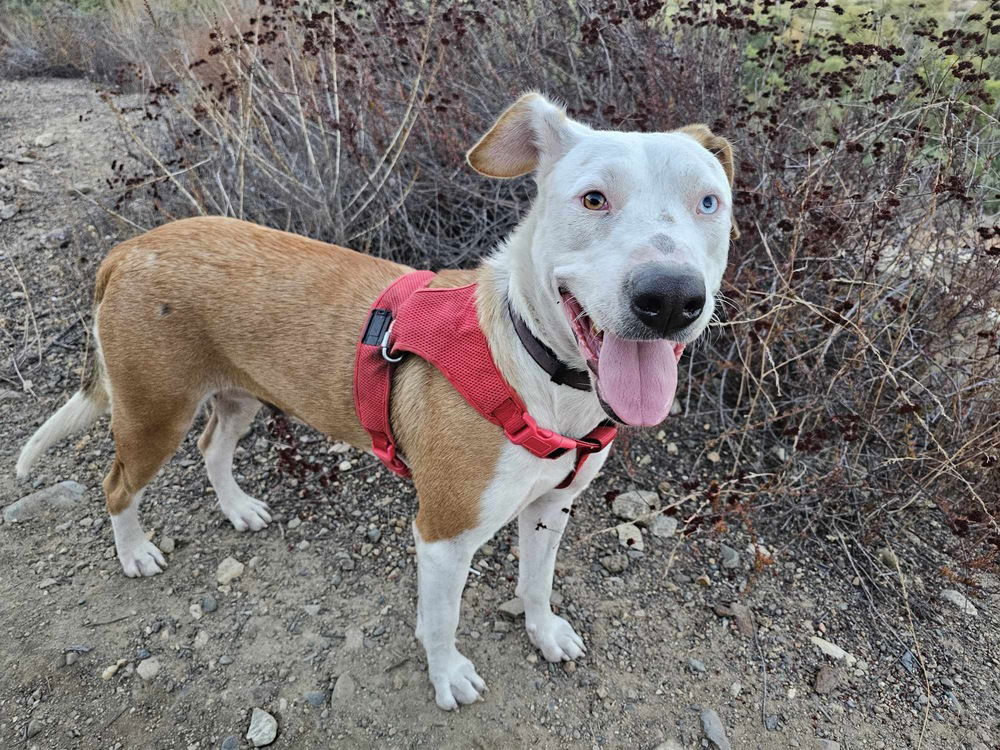 Sadie is a 2-year-old terrier mix with a heartwarming story. Saved from euthanasia along with her puppies, she is now ready to find her forever home. Weighing around 50 lbs, Sadie is intelligent, playful, and full of personality, with striking two-toned eyes—light brown and blue—and adorable floppy ears. She gets along well with both people and other dogs and was a wonderful mother. Sadie’s low-maintenance coat and love for outdoor activities, like playing with pinecones, tug-of-war, fetch, and hiking, make her an ideal companion for an active family. If you’re looking for a sweet, loyal dog, Sadie is eager to bring joy to your life! Interested in adopting this pet? Please contact us at questions@awishforanimals.org for more info.