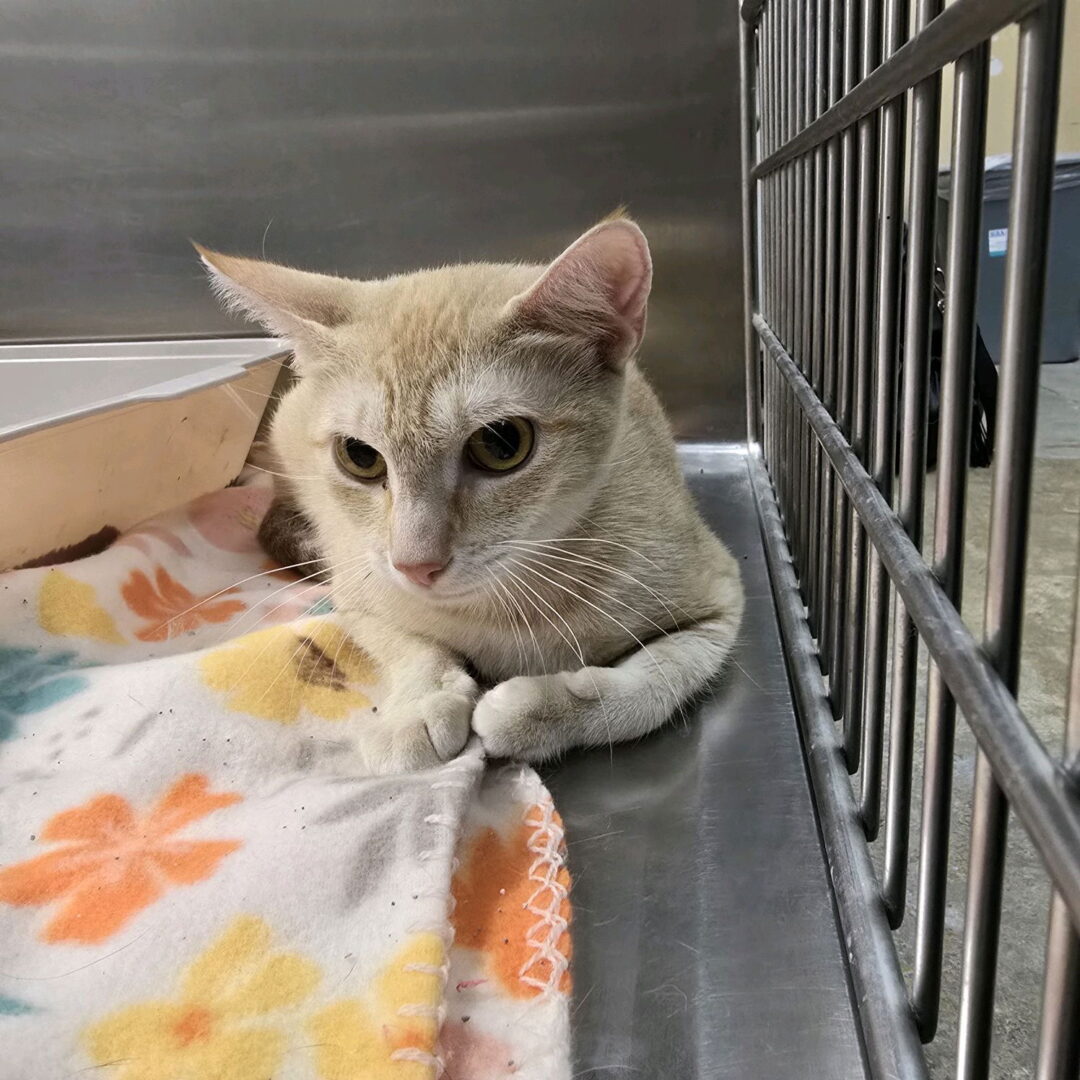Saffron (24-1146, F, spayed, approx 1 year old). Beautiful Saffron came to us with her three adorable babies. She is extremely shy but friendly and loving once she becomes familiar with people and her surroundings. She will need an adopter who understands that shy kitties take time, patience and lots of love to learn to fully trust. We do not recommend her to families with small children as she tends to give (harmless) "love bites" if overstimulated. Once she becomes comfortable, she is very affectionate and loves to play.