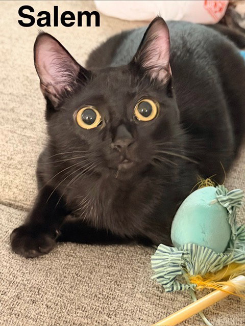 ✨ Meet Salem, your little pocket-sized wizard! With his sleek black coat and curious golden eyes, Salem looks like he just stepped out of a spellbook. At first, he can be a little cautious—after all, every good familiar knows to test their humans before revealing their magic. But once he’s sure that mealtimes are steady and love is plentiful, Salem shows his true self: a playful, snuggly little sorcerer who will enchant you with purrs and cuddles. He loves to play with his humans. Whether that’s chasing a laser, wand, string or feather toys. Salem would do best with patient adopters and a quieter environment where he can come out of his shell at his own pace. Give him a little time, and you’ll gain a loyal, fun-loving companion! You won’t just be bringing home a kitten—you’ll be welcoming a touch of everyday magic into your life.To inquire about adopting this cat please complete an adoption application at tinyurl.com/ccapadoptions Once you submit an adoption application, a foster will reach out within 48 hours to schedule a meet-and-greet or ask any additional questions. If you haven’t heard back within that time, please contact **adoptions@sanantonioferalcats.org** so we can follow up. If the cat you’re interested in isn’t listed in the dropdown menu, it may be pending adoption or recently adopted, but the website hasn’t been updated yet. Feel free to email us for confirmation. Thank you for choosing to adopt one of our amazing cats!