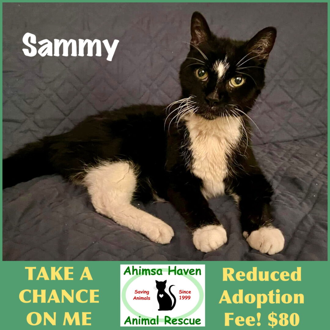 Meet Sammy, an 18-year-old purring machine with a heart full of love. Despite his senior status, Sammy is as lively as ever, charming everyone with his sweet and friendly nature. His intelligence shines through in the way he interacts with his surroundings, showing a loyalty that is truly endearing. Sammy has a particular fondness for men, often seeking their company and affection. His purring, a testament to his contentment, is a soothing melody that will bring warmth to any home. His age does not define him, but rather adds to his charm. With Sammy, you’re not just adopting a pet, you’re welcoming a companion who will offer unwavering loyalty and love. Sammy deserves a forever home where he can continue to spread joy and companionship. Sammy is also part of the Take A Chance On Me Program. This means his adoption fee has been reduced for the right home. If you are interested in adopting, please fill put an application online at ahimsahaven.org . Meet and greets are with an approved application by appointment only. As always, cats that are ready to be adopted are spayed/neutered, have age appropriate shots, are micro-chipped, dewormed/deflead, and FEL/FIV tested.