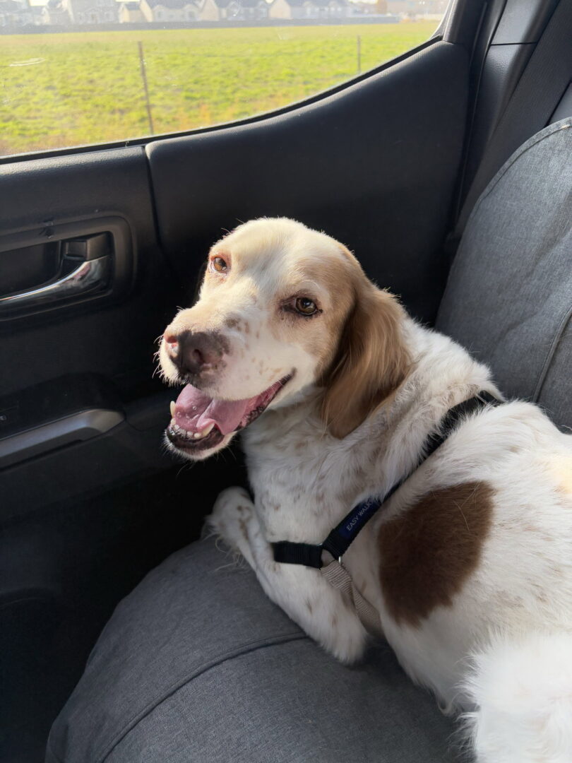 Sampson is a 50-lb, approximately 8-year-old English Setter who came to SWESR after being found as a stray in Utah. He’s settled into his foster home beautifully and has proven to be a sweet, smart, and adaptable boy. Sammy helped choose his new name (lots of tail wagging) and responded to it ever since. He’s fully house-trained and clearly communicates when he needs to go outside. He’s also quite talkative in general; whether he’s asking for a walk, a treat, or some attention, he’ll let you know. He can stay home uncrated for 4–5 hours without any issues. At night, he sleeps soundly on his dog bed next to the human bed and regularly logs a full 8+ hours. Sammy is very affectionate and loves being close to his people. Hugs and couch snuggles are high on his priority list. He has been working through some mild resource guarding of his humans, particularly around sharing lap or couch time with other dogs; but he has made steady progress. He currently lives with two other male English Setters and gets along well with them. He does not guard toys or food. He’s an active dog who does best with regular exercise and mental stimulation. His foster mom walks him up to 5 miles a day, which keeps him happy and relaxed in the evenings. He enjoys long walks, trips to the dog park, and car rides (he’s quite enthusiastic about riding shot-gun). Because he was a stray, he can get very excited at doors and may try to push past when heading outside. This is easily managed by leashing him before opening the door. He’ll need a home that’s mindful about keeping doors and gates secure. Once outside, he is not a fence jumper or climber. Due to the door excitement and his mild guarding of human attention, Sammy would likely do best in an adult home or one without young children. Overall, Sampson is a loving, active companion who bonds closely with his people and thrives with structure, exercise, and affection. He has the cutest little face and is a very special boy. It will be hard for Foster Mom to say goodbye, but he deserves a family all his own.