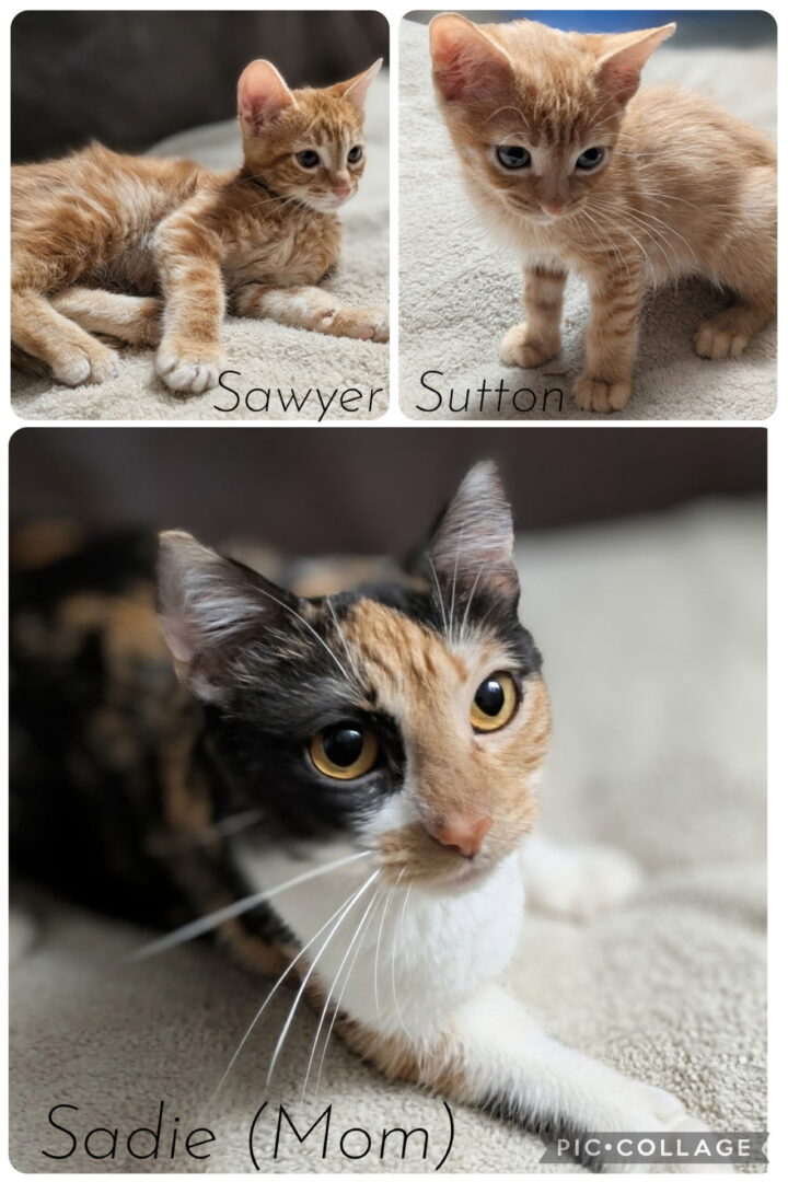 Meet Sadie and her two boys: Sawyer and Sutton! This adorable family was being given away at Target. They were taken in by an amazing foster who is helping them in their journey to find a forever home. They are in a foster home with other cats and are all very social and sweet. These sweet babies are looking for a place of their own. If you are interested, please fill out an application on our website. A meet and greet and home check are required. Their adoption fee includes their spay or neuter, vaccines, dewormer, microchip, and FeLV/FIV testing.