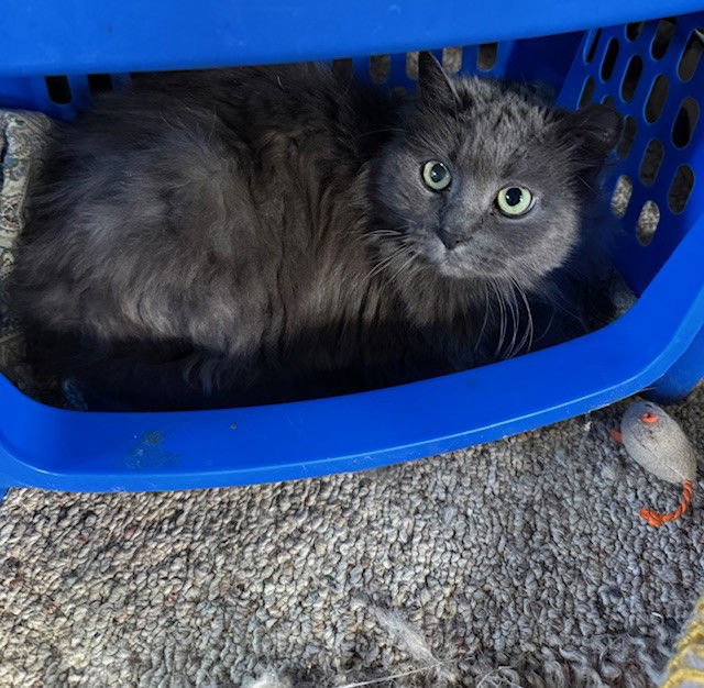 Scarlet is a beautiful long haired solid gray cat. She is very timid and would need to go to a home as an only animal. Grooming needs are high as she has very soft long hair and will requiring grooming several times a week. If you have experience working with very timid cats and would like to consider meeting her, please visit our website: kvckr.com and submit an application.