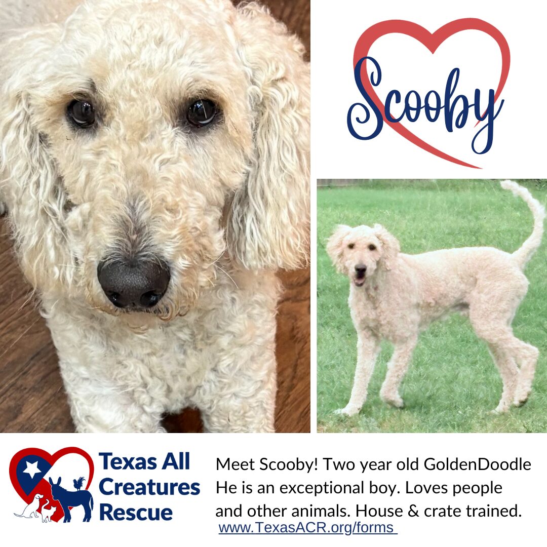 See Scooby’s HomepageGo to our official website Meet Scooby, Your Goofy, Lovable, Lap-Dog Wannabe! Scooby is a two-year-old Goldendoodle who’s ready to leave his rough start behind and leap into his forever home! He was found wandering as a stray in a rural Texas town, matted to the skin, underweight, and in desperate need of a fresh start. After a much-needed spa day (OK… a full shave), Scooby is feeling fantastic and has truly come to life! Now this playful, happy-go-lucky guy is making up for lost time. He LOVES playing with other animals, adores people, and will happily climb into your lap like he’s a 10-pound pup, not a full-sized dood! If you’re looking for a goofy, loyal, and lovable buddy who’ll be your partner in crime and cuddle, Scooby is your guy! Apply to adopt at TexasACR.org #TexasACR #AdoptScooby #GoldendoodleLove #RescueDogReady We are a non-profit 501c3 Animal Rescue located in Dallas/Fort Worth, Texas. Our passion is centered around assisting animals that have been abandoned, neglected, or abused. We are a foster-based rescue consisting of 100% volunteers. If you are interested in becoming a foster, please email info@TexasACR.org
