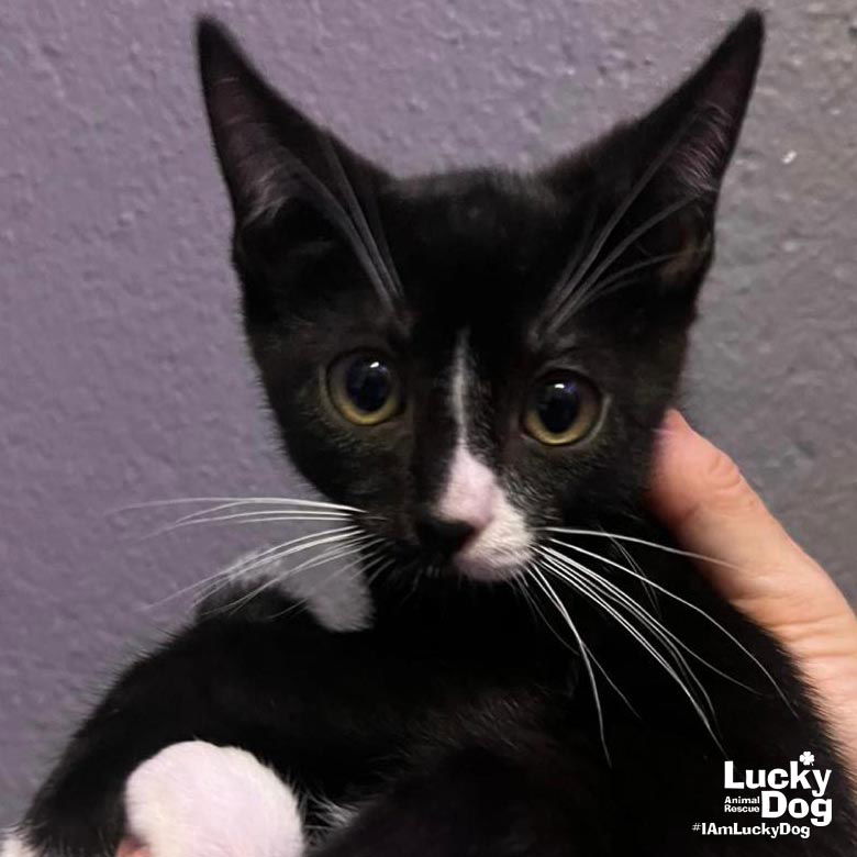Please contact Mollie Gorney (mollieg@luckydoganimalrescue.org) for more information about this pet.Handsome kitten needs a forever home!SENOR ACE NEEDS A FOREVER HOME! COME MEET SENOR ACE AND OTHER GREAT ADOPTABLE CATS ON SUNDAY 6/15 FROM 12PM-3PM AT THE PETSMART IN FALLS CHURCH (6100 ARLINGTON BLVD, FALLS CHURCH, VA)! Name: Senor Ace Best Guess for Breed: Domestic Short Hair Age: 13 weeks as of 6/3 Estimated DOB: 3/4/25 SEX: Male Approximate Weight: 2.2 lbs a/o 6/3 Coloring: Black and White Type of Hair: Short Gets Along With: Because of his young age, Senor Ace will likely get along with other cats, dogs and kids with an acclimation period. We’re happy to help with tips and tricks!Litter: Senorita Cherry, Senorita Ginger, Senor Ace, Senor Dallas, Senorita Tiffany, Senorita Trixie Currently Living at: Shelter – coming to the DC area soon! I am Looking For: My loving forever family! Hi! I’m Senor Ace, and I am a cute little kitten! I won’t ask for much- just some love, cuddles and lots of toys so I can run and play and be my kitten self. Two kittens are better than one – consider adopting one of my super cute siblings too! What my Foster Says About Me: Coming soon! Kitten Vetting Requirements: Your kitten may not be fully vaccinated upon adoption. You will be responsible for providing whatever remaining vaccines are needed to complete the kitten vaccine series. Due to this kitten’s young age, she/he has not yet been spayed or neutered. As part of the adoption contract, it will be your responsibility, as the adopter, to ensure that this is done no later than 9/4/25. There are NO EXCEPTIONS and NO EXTENSIONS to this date. A non-refundable spay/neuter deposit will be collected if you would like Lucky Dog to pay for this animal to be spayed/neutered at one of our low-cost partner vets. TO ADOPT: The adoption fee for adult cats is $200 ($350 for two cats adopted together). The adoption fee for a kitten (under 7 months old) is $220 ($380 for two kittens adopted together).If you are interested in adopting, please complete the Adoption Questionnaire online at bit.ly/adoptaluckycat. Lucky Dog Animal Rescue does our best to provide accurate information about the cats we have for adoption. That said, we cannot make any guarantees about age, breed or temperament. Thank you for contacting Lucky Dog Animal Rescue and helping to save a life! Please visit us online at www.luckydoganimalrescue.org . BE A FOSTER!!! Fosters make it possible for Lucky Dog Animal Rescue to save and care for homeless and abandoned dogs! To learn about fostering, please contact fostering@luckydoganimalrescue.org BE A SPONSOR!!!! Sponsors help Lucky Dog support the many dogs we save. To learn more about sponsorship, please contact info@luckydoganimalrescue.org !