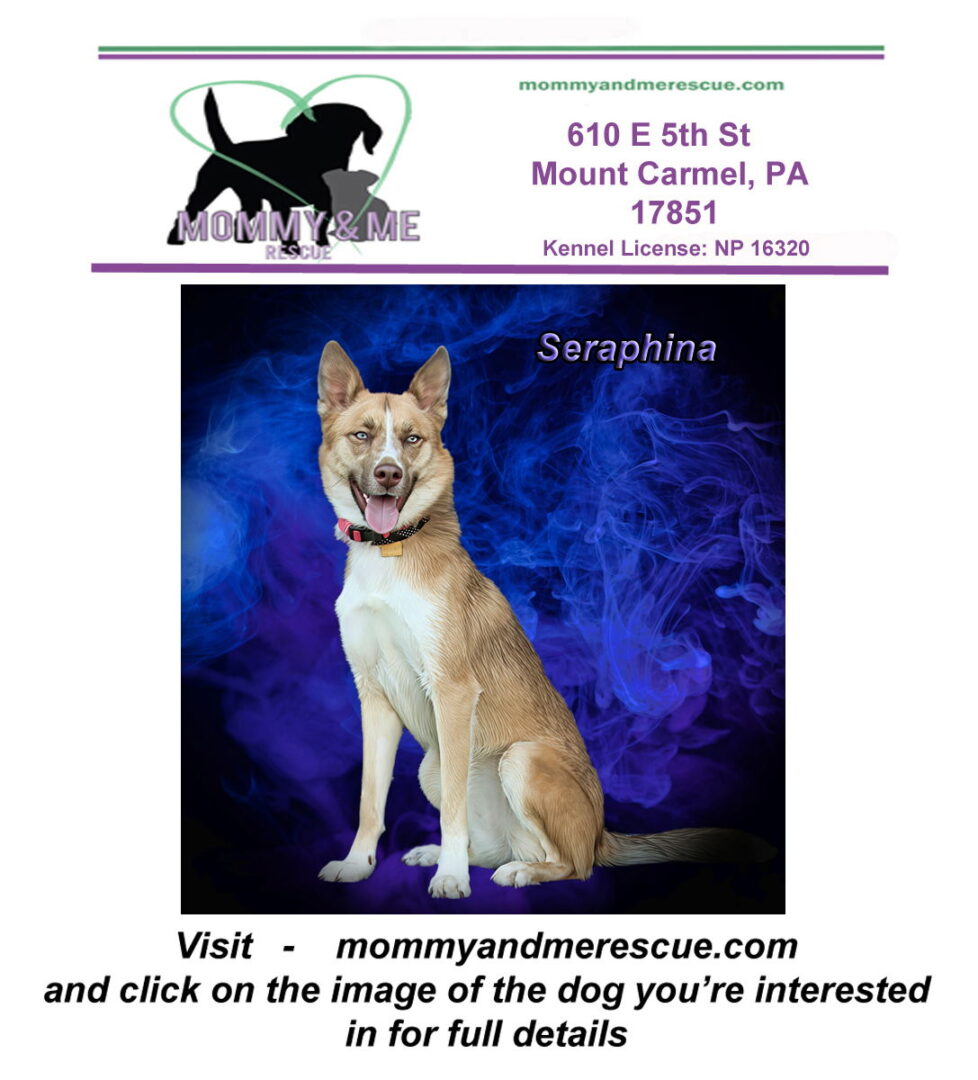 See Seraphina’s HomepageGo to our official websiteYou can fill out an adoption application online on our official website.All adopters are required to meet at our rescue center in Mt Carmel, PA (no exceptions). Please EMAIL all questions to rescue.me.pa@gmail.com Please fill out an application here > https://mommyandmerescue.com/adoption-application/ and give your vet clinic permission to speak with us. Spayed/Neutered, UTD on vaccines, Chipped Adoption fee 400 You must submit the application and be approved prior to meeting one of our dogs. Please add our EMAIL to your contacts! rescue.me.pa@gmail.com Kennel License: NP 16320 Seraphina Husky/Shepherd mix 1 ½ years old Weight: 36 pounds Seraphina has been let down by humans several times. Seraphina is excited about life and likes to share that excitement with everyone. Seraphina loves other dogs and kids. Seraphina is house-trained and crate-trained. She loves playing, going for walks, and would love hiking or jogging with her person/s. Seraphina does climb fences so she either needs a very secure yard (privacy fence) or someone who goes out to potty with her on lead. She may outgrow this with time and training. Seraphina is sweet and affectionate and like all huskies, she is vocal. Seraphina was trained at FIDOS SCI Coal Township and knows the following: Heel Kennel Sit Wait Down Come Sit Pretty Bang Spin License: NP 16320 PLEASE NOTE- we do not refund deposits if you change your mind. We are a PA licensed, 501C3 non-profit rescue. Visit our page for more information http://www.mommyandmerescue.com/