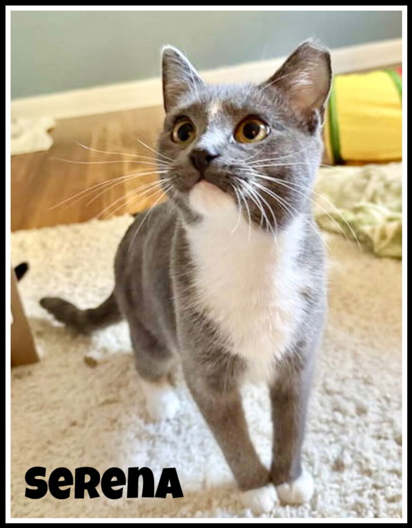 Say hello to Serena! This sweet girl is just under a year old and flaunts in a beautiful gray-white tuxedo outfit with hidden swirls within! She has the biggest eyes and the cutest face. Such a model. She was found alongside her sister Venus (see separate bio – FCID# 08/03/2025 – 142) who we believe she is bonded with. Serena is quite the chill kitten during the day with bursts of playful energy here and there. However, she would rather loaf nearby and stare deeply into your eyes than chase around a toy. But when it comes to Churus and other treats, she definitely comes out of her shell. Serena is a bit reserved and modest at first but starts to open up with consistency (and lots of Churus). After a bit of time, she will come around on her own for pets and to play. She loves to swat around balls and to chew on cardboard! She can be picked up for brief periods of time, longer if there are treats involved. She would be best with someone who lives in a quiet home without young children or dogs, and who has patience to let her get comfortable and open up. She is healthy, FIV/FeLV negative, spayed, and up to date on all her vaccinations/dewormers. Serena would love to find a home with her sister, Venus, although we do not think it is 100% necessary. Contact Serena’s foster parent (Nicole) for more information or pictures! Serena and Venus were playing with their foster family. They are now playing in our Jenkintown PetSmart adoption center. Please submit a no-obligation application for a meet and greet to adopt: https://forgottencats.org/adoption-application/. Thank you! (Foster: Nicole R.).