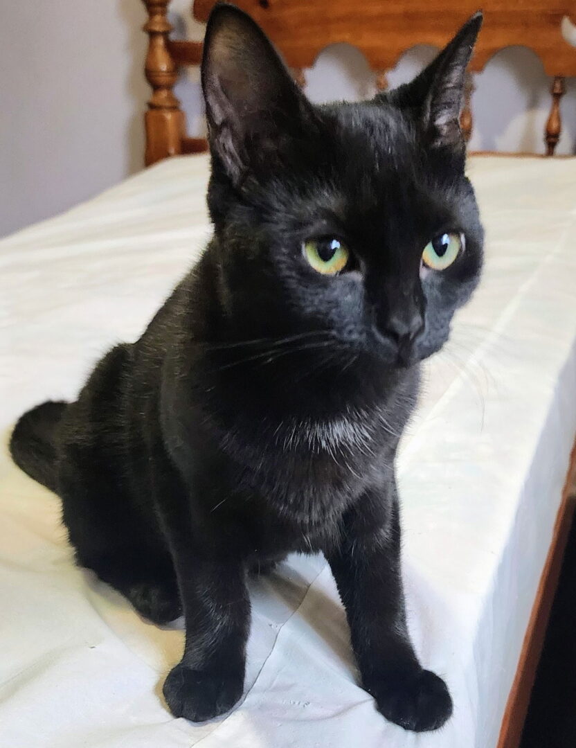Meet Shade, a black female kitten about 6 months old. We are thinking she was born sometime around June of this year. Shade is a quiet, gentle soul who is very shy at first but with a few calm words and most importantly, belly rubs! Then she will be your sidekick for sure. Shade has a calm, laid-back personality. She lives with a few house cats, who she doesn’t mind at all. Shade also lives with an extra-large (100 lbs +) house dog and she is scared of her and her size so maybe a little dog would be okay. She is still not sure yet about the “red dot” yet but Shade likes her string toys that fly across the room the most. Shade loves interaction with her people, preferably in the form of soft, gentle belly rubs. I can’t say it enough but this is the way to this girls’ heart. Shade is good with: Children: Sure but older children, Cats: Yes, she does not mind having friends around. Dogs: Shade is okay with a dog in the home. Shade is playing with her foster family. Please submit a no-obligation application for a meet and greet to adopt today: https://forgottencats.org/adoption-application/. Thank you! (Foster: Sonia G.).