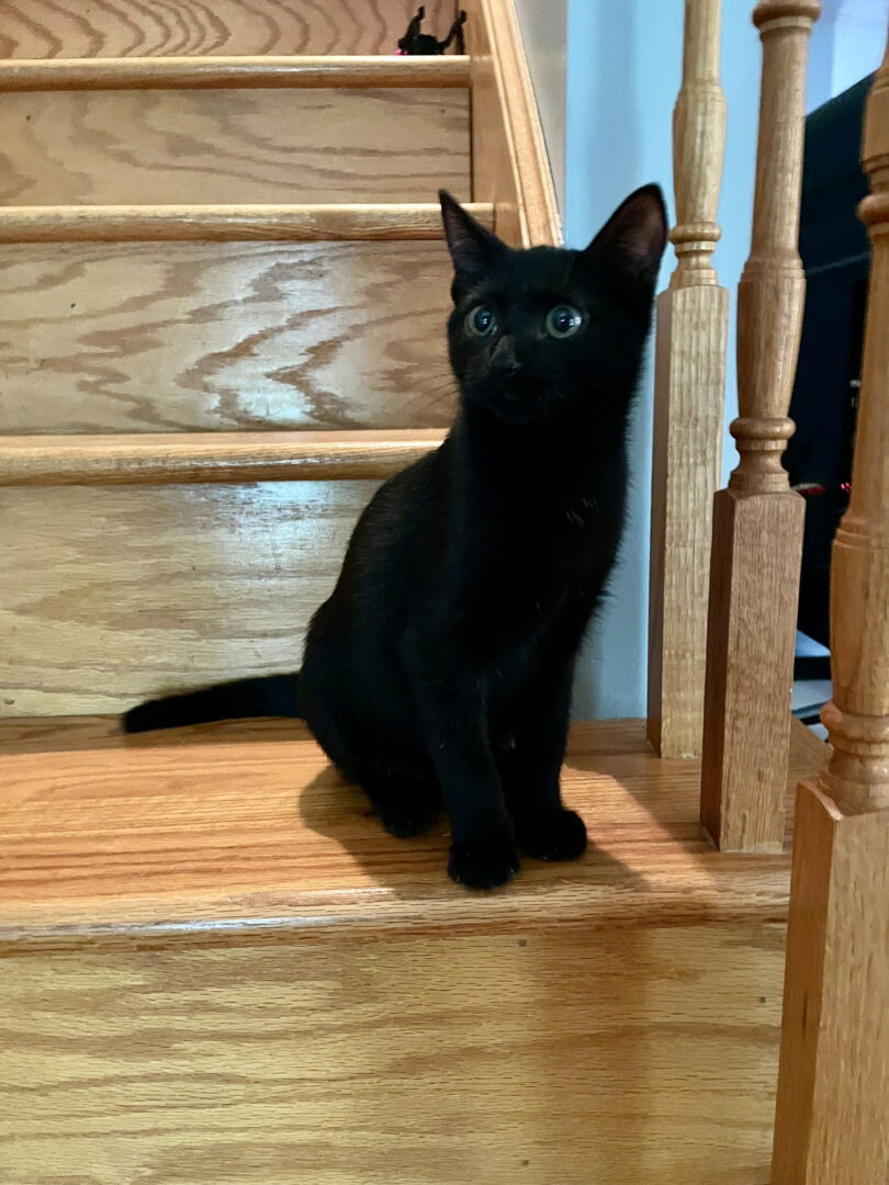 On medical hold – After Shadow's neuter surgery, he took a turn for the worse. Shadow developed an FIP infection which is fatal without medical intervention. We quickly were able to get the medication he needed and we are happy to say that he is doing great now. Shadow will need to complete his antiviral medication before being adopted. He should be a completely healthy boy then. Shadow will be available for in early January, but that doesn't mean you can't apply for him now. He would love to know he has a forever home as his christmas present! Shadow, brother of Onyx who has been adopted, is a handsome kitten who is full of energy. He is estimated to have been born around July 2024. He is very friendly and loves attention. He even enoys snuggling the dog. He loves to play hard then come snuggle up for a nice nap. He is even learning to fetch a toy mouse. Shadow is cat, dog, and kid-friendly. He is also up to date on vaccines and neutered.