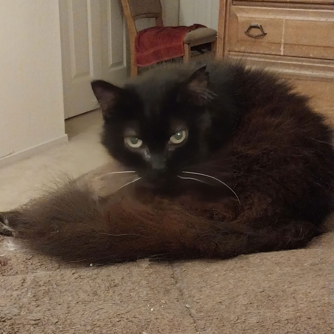 CONTRA COSTA COUNTY, CA: Shadow and Chinchilla (Chin Chin) are a sweet bonded pair of lovely kitties that were rescued together from a large cat colony. They appear to be Maine Coon-mix cats, and are probably mother and daughter. They both have amazingly loud purrs! Shadow and Chin Chin’s rescuer, Sara, provided us with this description of the girls: “Shadow was born in approximately May 2012. She's very small for a Maine Coon mix (about 6 pounds) and has gorgeous all-black fur. She loves to be brushed and petted and often meows loudly. Her fur is curly, so regular brushing is needed to keep mats from forming. She's even gotten used to stand-up brushing of her belly and will jump onto the cat condo so I can reach her more easily. Once there, we sometimes touch noses. She's the sweetest girl. She's very docile and calm once she gets familiar with you and the household. She doesn't even run when I vacuum. She's also very good about eating oral flea medication with tuna or sardines. Chin Chin is gray and white and was born in approximately May 2016. She's a bit flighty and will run away at first, even from me, but comes back as soon as I start petting or brushing another cat. She returns even faster when I'm dispensing treats. She is very playful and chases balls and other toys around the room. She even has a regular morning romp with another cat from the colony. Both girls are going to be shy at first with new people but with patience and gentle talking, treats and eventually brushing, they'll come around. Both of them have purrs that practically shake the house. I can hear Chin Chin purring from another room, and she'll start even before I touch her. Shadow starts drooling when she's purring. It's so cute! There's no way of knowing for sure, but I believe they are mother and daughter. They are definitely a bonded pair. Both are in good health. I give Shadow daily hairball gel and Chin Chin a powdered probiotic in her food. They are good about using the litter box and grooming themselves. Shadow and Chin Chin have both been spayed and will be up to date on vaccinations prior to adoption. They are good with other cats. They might be okay with older, respectful children, or with a very calm and cat-friendly dog." ~~~~~~~~~~~~~~~ This is a Courtesy Post, and Shadow and Chin Chin are living in a private foster home with their rescuer Sara in Hercules, California. If you would like more information, please contact Sara at s_garetz@yahoo.com. Please Note: These cats have not yet been tested for FIV/FeLV, to our knowledge. Potential adopters should confirm the cats’ status with their rescuer and should consult with their veterinarian for recommendations regarding testing.