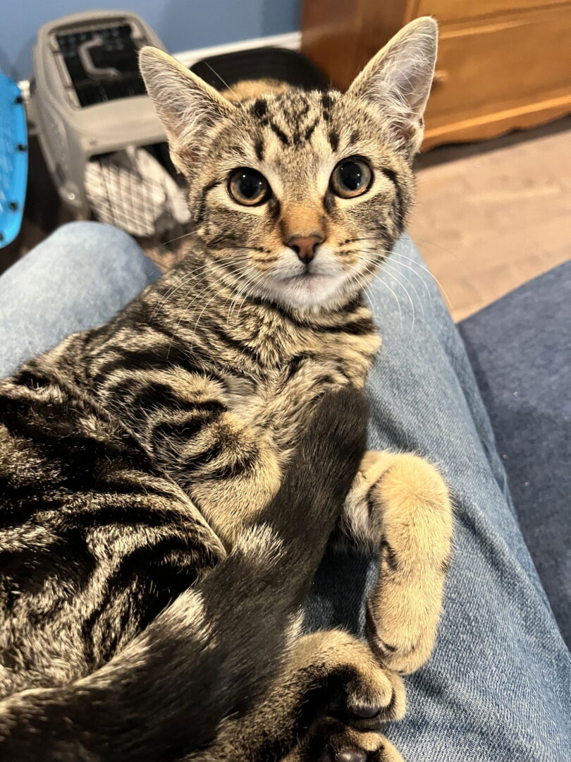 Say hello to Shanaya of bonded pair Shanaya and Celine! This striking tabby kitten will melt your heart. At about 4 months old, she is as playful and sweet as ever. Shanaya will happily curl up in your arms for as long as you’ll let her. She enjoys chasing her spring toys and tackling her sister, Celine. Shanaya and Celine are a bonded pair and must be adopted together. They would do well in a lively home that has lots of attention to give them. They are energetic and would do well with other friendly, young cats. They would probably do well living with a dog if introduced properly. Their mother, Cassie (FCID# 11/18/2025-114), is also available for adoption. Shanaya is playing with her foster family. Please submit a no-obligation application for a meet and greet or to adopt today: https://forgottencats.org/adoption-application/. Thank you! (Foster: John Y.).
