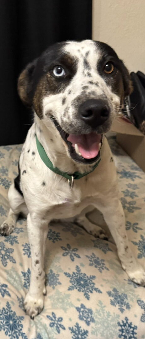 See Shelley *LOCAL*’s HomepageGo to our official websiteYou can fill out an adoption application online on our official website. To apply to adopt this dog now, complete our adoption application HERE To see our upcoming events where you can meet some of our dogs, please see HERE Age: 2 Yrs. (as of 03/31/26) Weight: 42 lbs (as of 04/16/26) Location: RI This dog has been spayed/neutered, is up to date on shots, on heartworm preventative and is microchipped. Beautiful Shelley is simply described as A Fabulous Dog! Shelley has only been in her foster home for a short time but she has settled right in with the adults and four small dogs. She is just fine being in her crate or roaming free and is left alone for the majority of the morning and afternoon. Shelley walks well on a leash, rides well in a car and is housetrained. She is excited to greet you at the end of the day but settles down quickly and is ready to cuddle. She really likes to be by her humans' side. We don't have info about how Shelley is with kids as of yet but we should know more soon. Shelley's striking good looks make an impact from her stunning white and black speckled coat to her black/brown face mask which highlights her incredible eyes. (1 brown and 1 blue) Shelley likes to play with other pups, enjoys a walk and checking out new places. When she meets new dogs she has been playful, calm or just decides to keep to herself. She has shown interest when meeting cats or smaller animals so far and is still being observed to see how she does with them full time. She is fairly quiet but may give an alert bark when she thinks it's warranted. Shelley is said to be affectionate, intelligent, even-tempered and gentle. Shelley's foster family calls her "delightful". We do know a little bit about Shelley's past. Shelley was an owner surrender as her family unfortunately lost their home and could only keep one of their pups when they moved. They had to surrender the rest. Shelley is now ready to find her forever home and to share her heart with her lucky new family. Medical Note: This dog has tested positive for exposure to ehrlichia. This does not mean that this dog had/has an active infection of ehrlichiosis, only that the dog was exposed or infected in the past. This dog is/has been asymptomatic while in SOS care and is being treated/has been treated preventatively with a 28-day course of doxycycline. This dog is ready for adoption, though may continue to test positive for exposure to ehrlichia for some time. Please see here for more information on ehrlichia, and please check with your vet before you apply to adopt this dog if you have any questions or concerns about this medical history. An adoption donation is required for each adoption; please see HERE for more information about this. To apply for this dog, fill out an adoption application on our website: Adoption Application – SOS Animal Rescue League in Rhode Island (sosarl.org) **Additional info you should know – For most of our dogs, we are only guessing at predominant breed or breed mix. We get to know each of our dogs as an individual and do our best to describe and place them based on personality not breed label. Some dogs may not yet be in New England, nor ready for immediate adoption. There may be additional vetting, quarantine, waiting periods and/or fees depending upon your state of residence. If you have questions or concerns on any of this, you can discuss this with your Adoption Counselor.