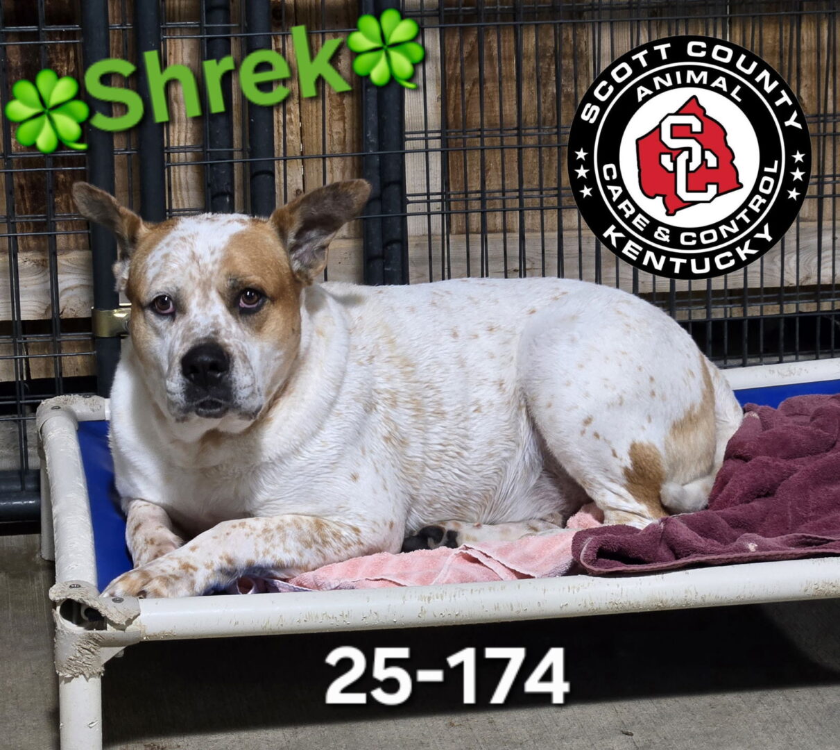 See Shrek’s HomepageGo to our official websiteYou can fill out an adoption application online on our official website.Shrek is a super sweet guy! Our best guess for his breed is 1/2 American Bully and 1/2 coffee table. LOL Seriously, he could be used as a coffee table if he would stand still! We LOVE this BIG guy!! All 120 lbs of him! He's the best boy and loves everyone. He's looking for a home where he can go outside and enjoy the sunshine, but then he would also want to snuggle on the couch and watch movies on rainy days. We will require a meet and greet with other dogs in the home. He would do best in a home with no cats. WEBSITE: scottky.rescuegroups.org
