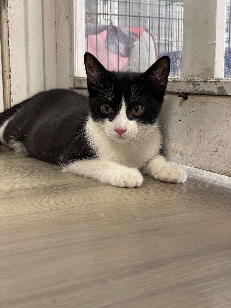 Signet is a black and white kitten with white paws born inside to a feral mother. Siblings are Pendant, Medallion, Bangle, and Cameo.