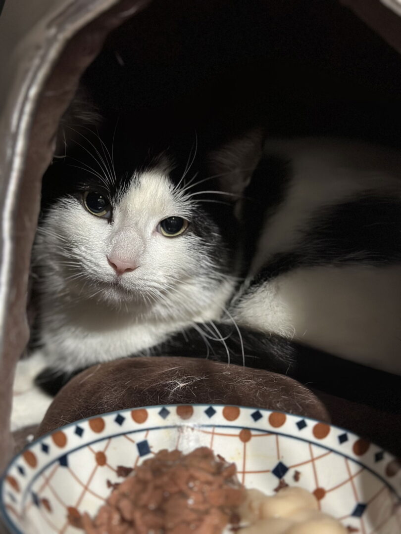 Silas was found on a good samaritan's front porch trying to get inside her home on a very cold, winter day. We were contacted and went to pick him up and bring him into our quarantine area. He is very healthy and his white is very clean. We suspect he is an owned cat. Not microchipped, not altered.