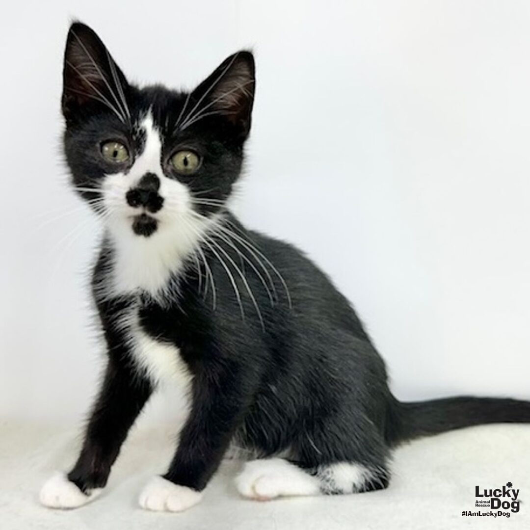 Please contact Lauren McCarty (laurenmc@luckydoganimalrescue.org) for more information about this pet.Sweet baby needs a forever home!SIM NEEDS A FOREVER HOME! Name: Sim Best Guess for Breed: Domestic Short Hair Age: 14 weeks 12/13 DOB: Estimated DOB 9/4/25 SEX: Male Weight: 3.16 lb 12/4 Coloring: Tuxedo Type of Hair: Short Litter: Sim, Spencer, Stokes Gets Along With: Because of his young age, Sim will likely get along with other cats, dogs and kids with an acclimation period. We’re happy to help with tips and tricks! Currently Living at: Shelter…coming to DC area soon I am Looking For: My loving forever family! Hi! I’m Sim, and I am a cute little kitten! I won’t ask for much- just some love, cuddles and lots of toys so I can run and play and be my kitten self. What the Shelter Says About Me: He has a mark on his nose like a 3 leaf clover. He’s one of three musketeers brothers. Cutest tux markings ever! He is a gorgeous little tuxedo boy that snuggles, plays and purrs almost all the time. He doesn’t see a stranger in humans and loves to romp in his condo with his brothers. Sim is social and confident and absolutely loves to be held as long as you want to hold him! Just looking at his pictures makes you happy and you can tell he is a showboat. Sim is a very special little fella looking to share a ton of love. What my Foster Says About Me: Coming soon! Kitten Vetting Requirements: Your kitten may not be fully vaccinated upon adoption. You will be responsible for providing whatever remaining vaccines are needed to complete the kitten vaccine series. TO ADOPT: The adoption fee for adult cats is $200 ($350 for two cats adopted together). The adoption fee for a kitten (under 7 months old) is $220 ($380 for two kittens adopted together).If you are interested in adopting, please complete the Adoption Questionnaire online at bit.ly/adoptaluckycat. Lucky Dog Animal Rescue does our best to provide accurate information about the cats we have for adoption. That said, we cannot make any guarantees about age, breed or temperament. Thank you for contacting Lucky Dog Animal Rescue and helping to save a life! Please visit us online at www.luckydoganimalrescue.org . BE A FOSTER!!! Fosters make it possible for Lucky Dog Animal Rescue to save and care for homeless and abandoned dogs! To learn about fostering, please contact fostering@luckydoganimalrescue.org BE A SPONSOR!!!! Sponsors help Lucky Dog support the many dogs we save. To learn more about sponsorship, please contact info@luckydoganimalrescue.org !