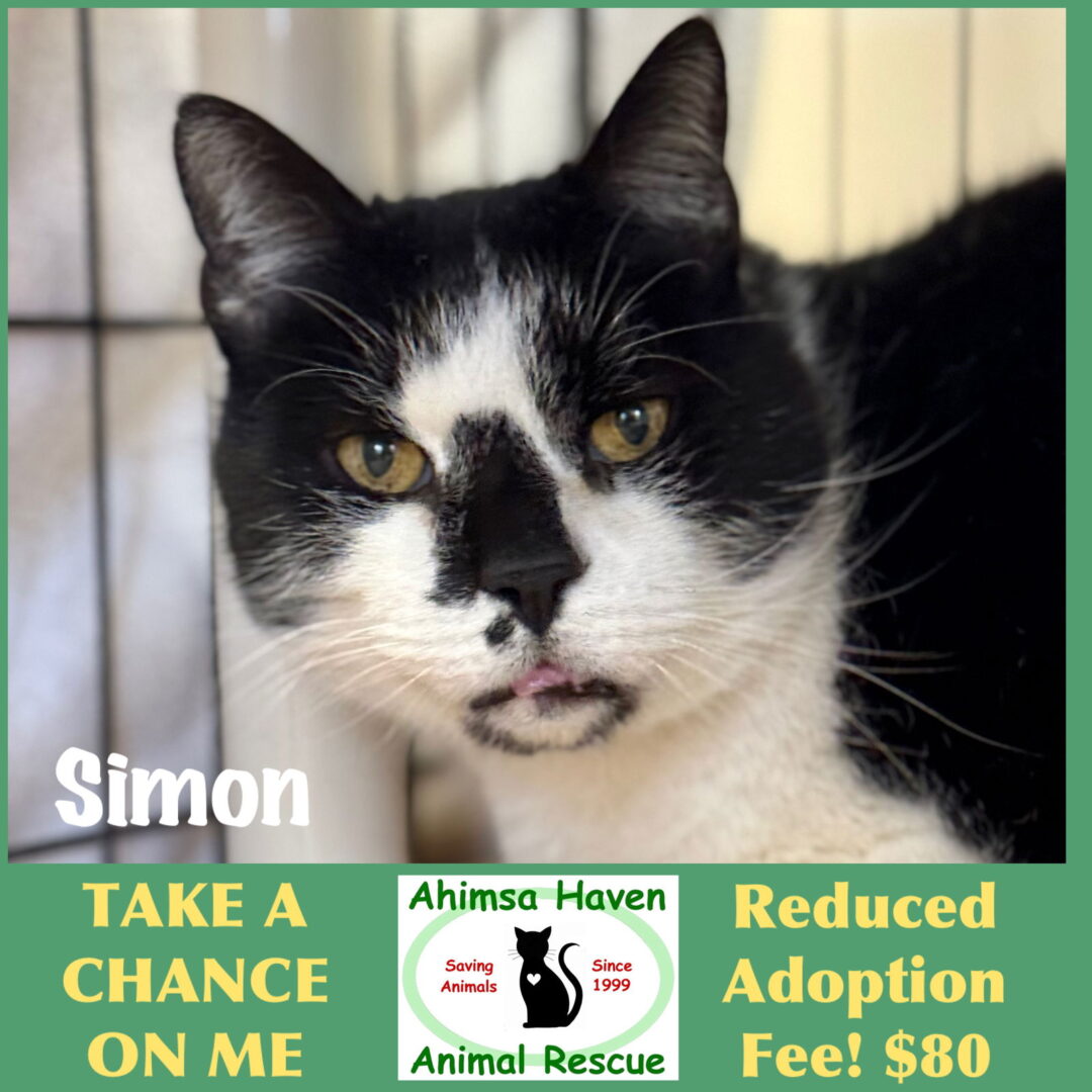 Meet Simon, a charming and friendly senior feline. At 12 years young, Simon‘s owner passed away and he had been living outside for 2 years. Now, he’s ready to be loved again and live out his his golden years with a new family who will cherish his friendly purrs and brave heart. If you’re looking for a companion who will offer unconditional love and a brave spirit, Simon is the cat for you. Simon is also part of the Take A Chance On Me Program. This means his adoption fee has been reduced for the right home. If you are interested in adopting me, please fill put an application online at ahimsahaven.org . Meet and greets are with an approved application by appointment only. As always, cats that are ready to be adopted are spayed/neutered, have age appropriate shots, are micro-chipped, dewormed/deflead, and FEL/FIV tested.