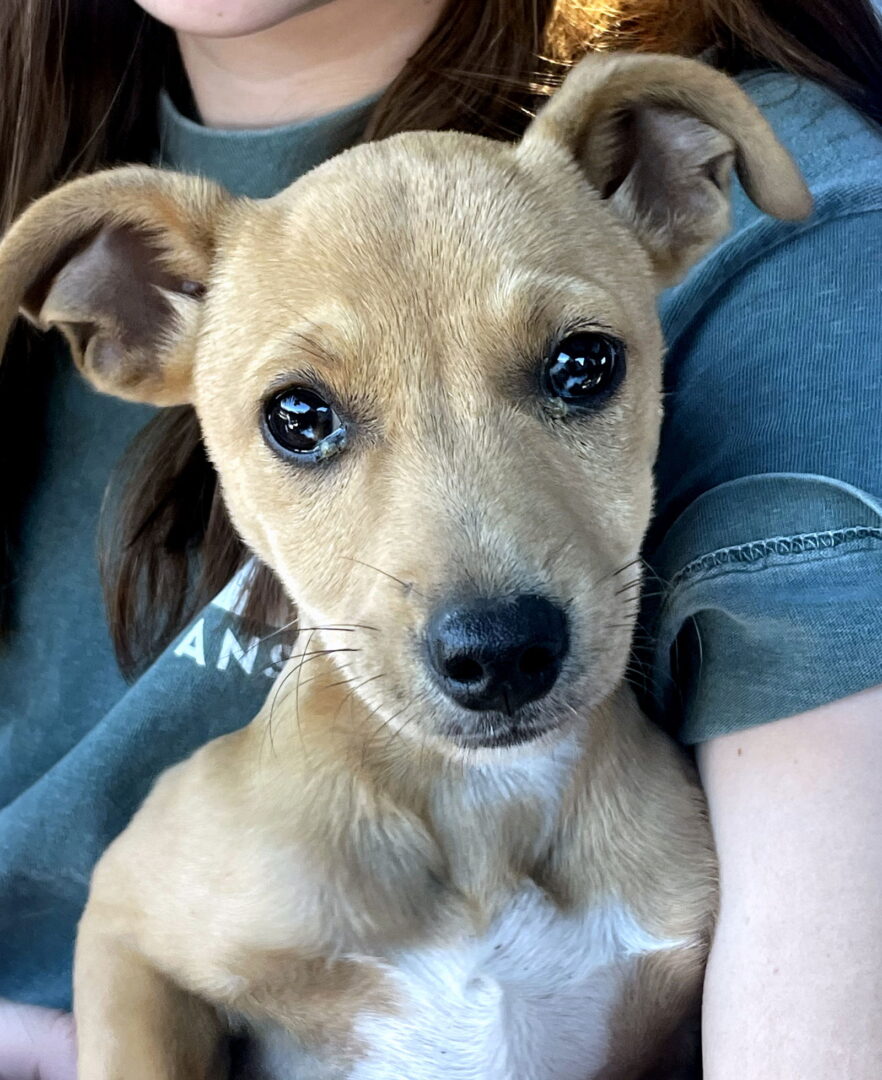 To apply to adopt this dog now, complete our adoption application HERE To see our upcoming events where you can meet some of our dogs, please see HERE Age: 3 months (as of 11/26/24) Weight: 10 pounds (as of 11/21/24) This dog has been spayed/neutered, is up to date on shots, on heartworm preventative and is microchipped. Sister is a delightful young puppy who may be a Chiweenie mix. She was found abandoned in a culvert near a farm and is now living in an active foster home with an adult couple, a school age son, a young teen daughter, two dogs, and farm animals. She is a happy girl and gets along well with absolutely everyone. Sister is very playful and will bark sometimes, but she is also responsive to corrections. At first, she was frightened when she was left alone, but she is doing much better and is fine in a gated room for a few hours. She has learned how to use a doggy door. She loves to cuddle with her people but also enjoys tug-o-war and chase with her canine pals. Sister loves all kinds of toys, too! She has spent almost no time with cats, so we do not know how she does with them, but we have no reason to believe that there will be any issues. She is an unusually quick learner and is already making incredible progress with her housebreaking and crate-training. She has not learned how to walk on a leash yet. Like many puppies, she can be a scamp, and she has already figured out how to climb over a baby gate. She can be a bit hyper, and will jump on guests and furniture, but that is normal for her age. We recommend training for all of our puppies, and Sister is so smart that she is likely to be a big star in her obedience classes. Sister is an affectionate and outgoing puppy who is going to be a wonderful addition to her new family! An adoption donation is required for each adoption; please see HERE for more information about this. To apply for this dog, fill out an adoption application on our website: Adoption Application – SOS Animal Rescue League in Rhode Island (sosarl.org) **Additional info you should know – For most of our dogs, we are only guessing at predominant breed or breed mix. We get to know each of our dogs as an individual and do our best to describe and place them based on personality not breed label. Some dogs may not yet be in New England, nor ready for immediate adoption. There may be additional vetting, quarantine, waiting periods and/or fees depending upon your state of residence. If you have questions or concerns on any of this, you can discuss this with your Adoption Counselor.