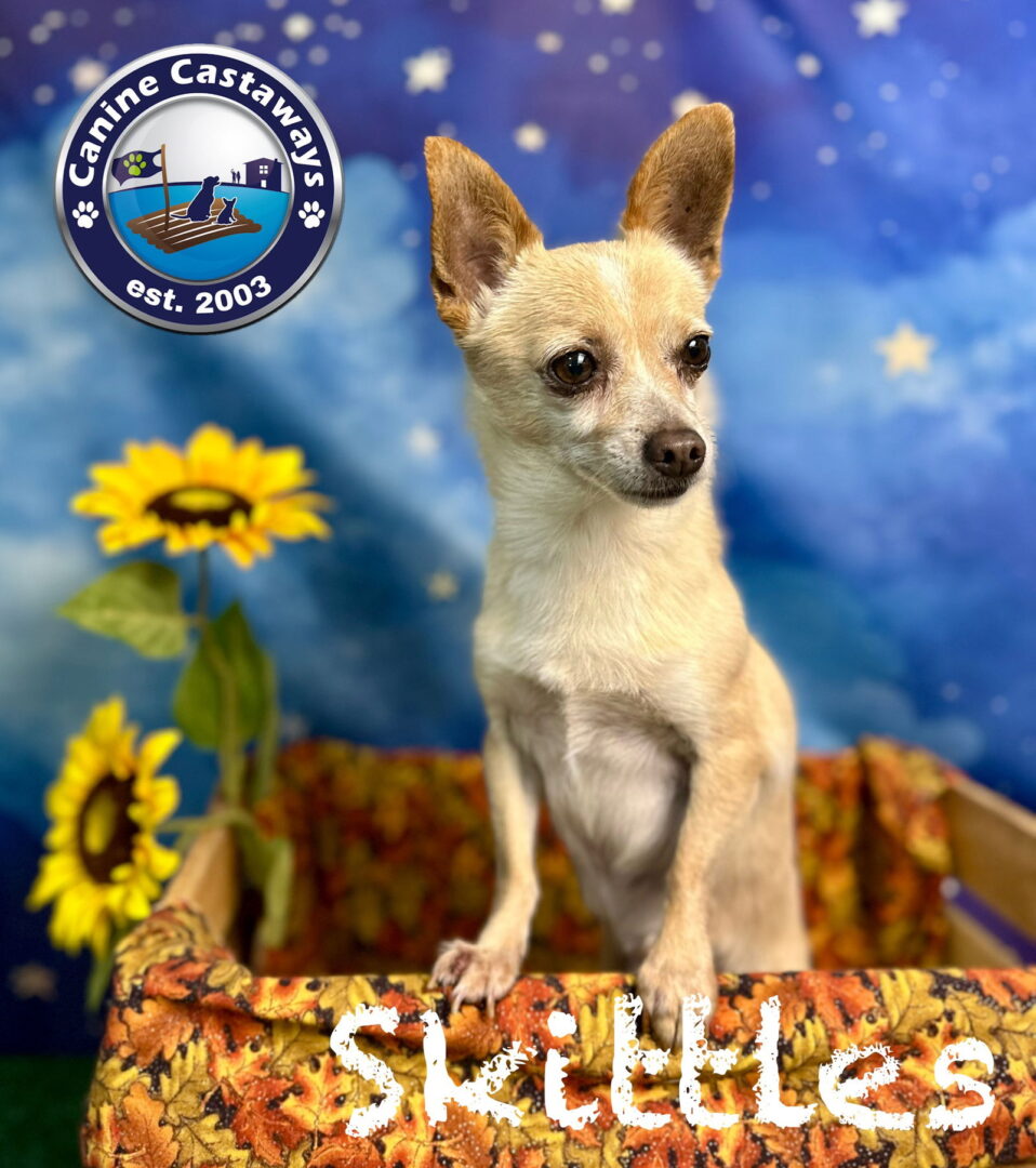 Filling out an application from our web site at www.caninecastaways.org is the first step in adopting a new furry family member.IF YOU ARE INTERESTED IN ADOPTING THE FIRST STEP IS TO FILL OUT AN ADOPTION APPLICATION ON OUR WEBSITE AT: https://www.caninecastaways.org/adoption-application IF A PET IS LISTED THEN THEY ARE AVAILABLE – WE KEEP OUR LISTINGS UP TO DATE AND REMOVE AS SOON AS ADOPTED. NAME: Skittles BREED: Chihuahua SEX: male COLOR: tan/white AGE: 5 yrs as of Sept 2023 WEIGHT: 6.6 lbs FOSTERED BY: LOCATED IN: NOTES FROM FOSTER FAMILY: Hi, I'm Skittles. I've been through a lot, you know. I fought off heartworms like a champ but I do take daily medication because of it. It was tough, but I'm brave and didn't let it get me down. I'm a curious fellow, always sniffing out new adventures. I'm also fiercely loyal, sticking by my friends no matter what. I've got a sweet side too, I love a good belly rub and a cozy nap. I've been told I have a knack for making people smile. I guess it's just in my nature. So, why should you adopt me? Well, I'm not just a pet, I'm a friend. A friend who'll be there for you, through thick and thin, who'll bring a bit of joy into your life. That's me, Skittles. Full of personality, absolutely sweet and loves to be held and center of attention, gets along with dogs and cats When Skittles came to us he was unfortunately heartworm positive. We have treated him for the heartworms and he is ready for adoption. Possibly due to the heartworms, he is currently on a heart medication and does have a murmur. NOTE: Local applications are given first priority and some out of town areas will not be able to be processed. At this time, we will only be able to process applications that have an excellent current vet history. If you haven’t had a pet or verifiable vet history we will not be able to process your application. If you are interested in adopting please complete our Adoption Application by copying and pasting the following link into your web browser: http://www.caninecastaways.org/adoption-application For a full list of dogs we currently have for adoption use this link: https://www.caninecastaways.org/adoptable-dogs MEDICAL INFO: The following has been or will be done for this dog… – Basic Exam by Veterinarian – Spayed or Neutered – Heartworm Tested – Placed on heartworm preventive – Basic Bloodwork – Urinalysis – Microchipped – Intestinal Parasite Exam and medication – Vaccinations – Placed on Flea preventive ADOPTION DONATION: $300 This adoption donation helps to cover the vet expenses for this dog including heartworm preventive which is dispensed at the initial vet visit and then goes with the dog at adoption. All vet records will be provided to adopter. Visit us at www.caninecastaways.org