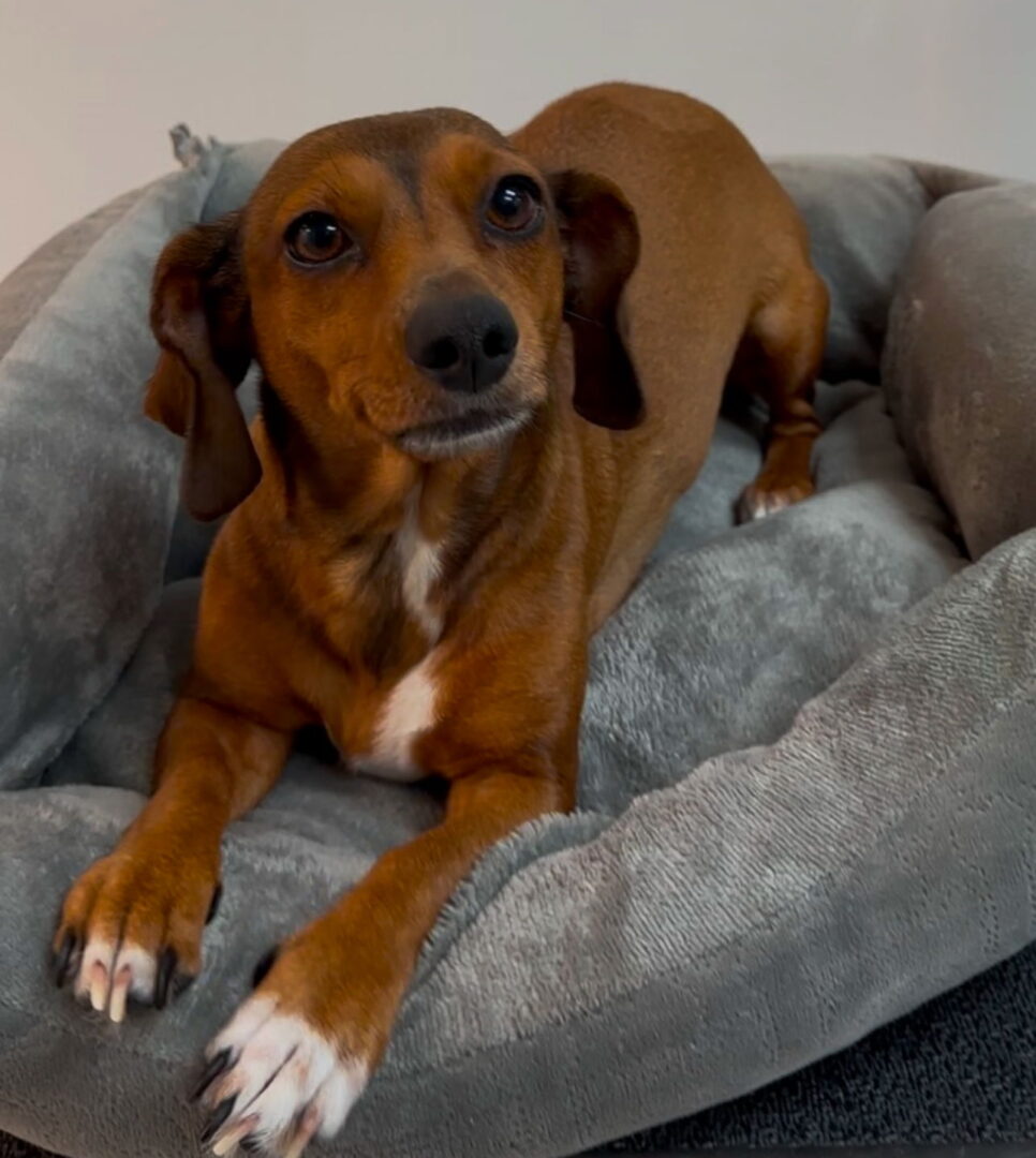 1 year old female dachshund mix 16 pounds of sweetness Skittles came to us back in October after making it to a local shelter after being hit by a car. She had a few fractures and a hernia of her diaphragm. She’s healed and doing great and all ready for her forever home. One of her injuries was a broken tail, it was unable to be fixed and it doesn’t bother her, so we did not have it amputated. Because of the damage to her tail, she cannot wag her tail. She shows her happiness with a smile and squirming around until she is belly up. Skittles is good with other dogs and with all people She’s a wonderful little girl If you are interested in adopting me, please complete the DRSF Online Adoption form.My adoption fee covers all my (prior) vet care (adopter receives vet records). For more information refer to the DRSF Adoption Fee page.If you have any questions about adoption or want more info, you can email: info@dachshundrescuesouthflorida.com