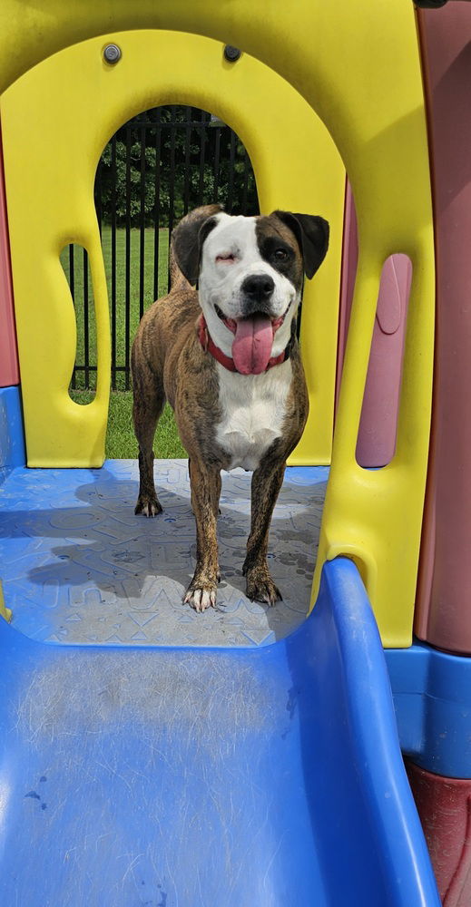 (DOB 05/30/2024) Skye, the one-eyed wonder with a heart full of love and a personality that shines! One eye, with two times the amount of character and all the charm & love you could ask for. Skye is a sweet & friendly girl who gets along great with other dogs, but she’d also be perfectly happy as your one and only, soaking up all the cuddles and attention. Skye loves a big fenced in yard, and we think that would be the best option for her unless her fur-ever had plenty of time to get her energy out daily. She'll do zoomies and then run right back to you for more love and attention. If you have play equipment in the yard, Skye isn't scared of it and will go up stairs, slide down the slide with you, so a family with older kids that would love a furry playmate, she could be a good fit. She'll chase after a ball if she is excited, but isn't really interested (at this time) in bringing it back to you, ha ha.She’s a good girl who keeps her crate tidy and is making steady progress with potty training. Skye walks on a leash well enough — she’s still learning, and she can get a little enthusiastic and underfoot, but that just makes her all the more adorable! She’s a quiet, curious girl who loves exploring new things and discovering the world around her.If you’re looking for a loyal, loving companion; she is a bit of a velcro dog and will follow you with her eye, follow her favorite person around, and follow you with her whole heart!! She definitely has a wonderful character and a whole lot of heart, sol look no further if LOVE is what you are looking for, Skye might just be your perfect match!As part of Skye’s $300 adoption fee, she is spayed, microchipped, up to date on age-appropriate vaccines, and current on her monthly flea/tick and heartworm preventatives. If you have questions about this sweet girl, you can email: Dogteam@pawsforlifenc.org. If you wish to adopt Skye, you can fill in an online application for her under the Adopt a Pet Tab on our website: www.pawsforlifenc.org.