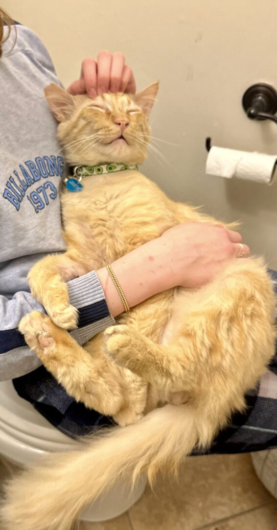 Hello! My name is Smiley, and I’m a stunning orange Maine Coon mix with a big, fluffy tail and an even bigger heart. I’m around 2–3years old and was recently rescued from the streets. Now, I’m ready to trade in my rough past for a cozy, loving forever home. True to my name, I’m a super happy and affectionate guy who loves people. When my foster family walks into the room, I greet them with purrs, happy tail swishes, and plenty of leg rubs. The moment you pet me, I turn on my purring motor and look up at you with gentle blinks that say, “Thank you.” As soon as you sit down, I will jump into your lap, purring loudly and look at you with the biggest loving smile. I had to hold my own outside, often fending off other male cats, so I would do best as the only cat. What I really want is a quiet, loving forever home where I can feel safe, secure and cherished for the next 12+ years. I’ve been neutered, vaccinated, dewormed, microchipped, and come with my medical record. I’m healthy, happy, and waiting to be someone’s adorable loving lap cat. Ready to meet me? Email info@lbsn.org to request an application. Once we receive it, we’ll schedule a time for you to come meet me! A $150 donation is requested to help offset my veterinary care. Help me turn the page to my next chapter—one filled with love, laps, naps, and smiles.