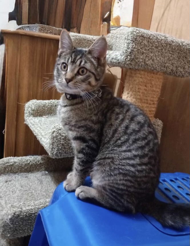 Hey there! I’m Snatch, the purr-fect partner-in-crime to my nearly identical twin sister, 'N Grab. We’re two peas in a paw-d, and our adventures together are nothing short of claw-some. While she’s zipping around like a race car, I’m usually right behind her, matching her paw-step for paw-step. I’m all about the thrills—laser pointers, toys, and wild play sessions with my crew. If there’s fun to be had, I’m not kitten around—I’m in! Like my sister, I’ve mastered the art of tearing through the house at lightning speed, leaving a trail of purr-fection in my wake. While we’re inseparable, I’d still make a paws-itively fantastic companion on my own. I just love having friends to play with, whether they’re feline, human, or both. If you’re looking for double the trouble (and double the fun), adopting me and 'N Grab together would be the cat’s whiskers! So, what do you say—ready to let me snatch a spot in your heart? Snatch =^..^= , DSH Brown Target Tabby , Female , DOB 9/8/2024 Adoption Application – Cat Around Town Project