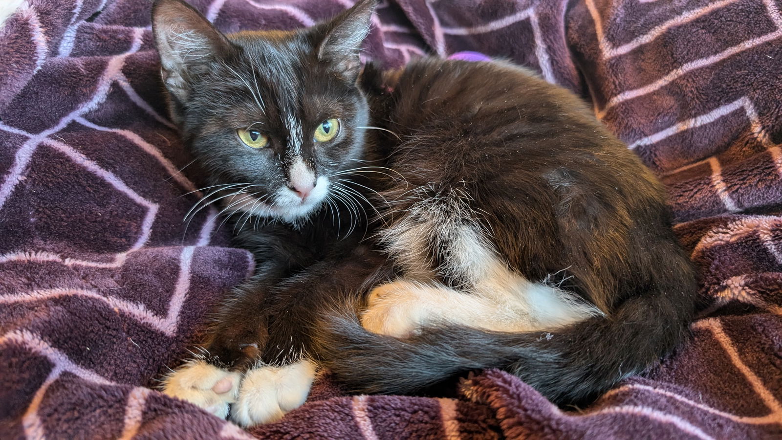 Please contact Marilyn (marileealong@comcast.net), (925) 788-4397 for more information about this pet. Want to meet? [Fill out the Application], then email it to the contact in this bio. Socks is an incredibly sweet kitten, loves being held and petted, and is always ready to play, either with her housemates or wand toy! She is a litter mate of Houdini (born probably May ’24) and was trapped in mid September at a feral colony in Pacheco along with Mittens, Houdini, and Magic, who are all with the same foster. Good with Kids – They all currently live in a large 4-tier cage (due to an 8 year old in the house with the worry that they will get outside if a door is left open). She gets to come out the cage every evening to play in a large room with her cage mates, and loves to chase around with Magic and Mittens. She also gets a lot of petting and attention in the cage from young kids and adults. Good with dogs – Lives in a house with a gentle Pitbull and he and the kittens all ignore each other! Contact Marilyn Number: 925.934.0413 Click here to watch a video of SOCKS.