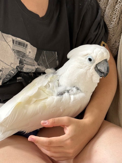 See Soki’s HomepageGo to our official websiteYou can fill out an adoption application online on our official website.Hatch Date: 2000Soki is a beautiful 25-year-old male umbrella cockatoo. He had a rough start, spending most of his first 15 years in a dark basement, and then was surrendered to a pet store, where he was purchased by a good Samaritan. She kept Soki for 10 years and gave him love and good care, but for reasons out of her control, she needed to surrender Soki. Soki is now settling into his foster family, and they are loving getting to know him! Soki loves attention, sings, dances, and likes to play catch with his many toy stuffies. He is starting to allow snuggles, and his fosters think he will be a wonderful lap bird when he finds his forever loving home. He loves it when his foster sister preens his head, and he returns the favor by preening her hair when she holds him.Soki loves his foster mom and sister, but he has started to seek out attention from his foster dad and brother now too. He wasn’t often handled by the man in his last home, and he may still choose a female primary caretaker. We are starting to believe that Soki could be the rare bird that likes his family members regardless of gender. Soki is a typical male Cockatoo, so we will favor an adopter with large bird experience. He can be extremely loud, but isn’t a habitual screamer as many male Umbrella Cockatoos can be. Instead, he typically has a loud period in the evenings, around 6:30-ish, where he engages in the instinctual, rhythmic flock calling, that many birds do. It usually persists for about five minutes, but then subsides, and his bedtime routine with his family can continue. That being said, this would need to be taken into account if there are any important phone conversations that need to happen.That includes Zoom classes, being taken, or same room activities that need to occur. It is not an exaggeration to say you should use a pair of noise canceling headphones or a set of earplugs to ensure no hearing damage occurs. Soki enjoys activities that a typical toddler would enjoy. He likes playing peekaboo, playing with his stuffy babies and toys, and watching Sesame Street and Curious George. After all, cockatoos are very much like super loud toddlers, but they won’t grow up and can live for 60+ years. They can also be very destructive, and destroy woodwork or molding in a mere second. So if you are interested in adopting Soki, make sure your budget can accommodate his love for destroying toys. Soki will only be adopted to a single-family, free-standing home.No exceptions.Soki is a big boy, with a strong beak, and he will not be adopted out to a home with young children, as he could potentially injure them. Soki is being fostered in Howell, NJHe will require three in-person visits before adoptionWe do not ship our birds. For the Love of Birds is a network of dedicated foster homes throughout NJ and Eastern PA. As our adoptable birds are living in private volunteer homes, We only allow approved adopters to make the required visits. If interested in adopting Soki, please visit our website ftlob.rescuegroups.orgPlease read our adoption policies and fees and complete an adoption application.