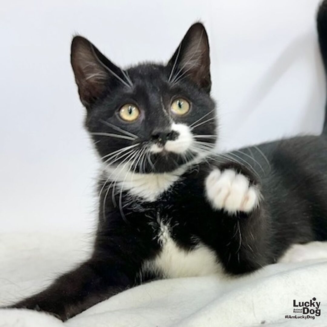 Please contact Lauren McCarty (laurenmc@luckydoganimalrescue.org) for more information about this pet.Sweet baby needs a forever home!SPENCER NEEDS A FOREVER HOME! Name: Spencer Best Guess for Breed: Domestic Short Hair Age: 14 weeks 12/13 DOB: Estimated DOB 9/4/25 SEX: Male Weight: 3.68 lb 12/4 Coloring: Tuxedo Type of Hair: Short Litter: Sim, Spencer, Stokes Gets Along With: Because of his young age, Spencer will likely get along with other cats, dogs and kids with an acclimation period. We’re happy to help with tips and tricks! Currently Living at: Shelter…coming to DC area soon I am Looking For: My loving forever family! Hi! I’m Spencer, and I am a cute little kitten! I won’t ask for much- just some love, cuddles and lots of toys so I can run and play and be my kitten self. What the Shelter Says About Me: Spencer This boy is plush, with debonair facial markings, and a tuxedo joy! He’s one of three musketeers brothers. He is a very social and confident young man and prefers to exercise his rights and make the first move. Once he has you & your heart in his grasp, it’s on. Spencer is very playful with his siblings and loves all kinds of toys and of course – the kitten food! Spencer loves to be held, accepts affection like a champ and is just waiting to spread the love in his own forever home. What my Foster Says About Me: Coming soon! Kitten Vetting Requirements: Your kitten may not be fully vaccinated upon adoption. You will be responsible for providing whatever remaining vaccines are needed to complete the kitten vaccine series. TO ADOPT: The adoption fee for adult cats is $200 ($350 for two cats adopted together). The adoption fee for a kitten (under 7 months old) is $220 ($380 for two kittens adopted together).If you are interested in adopting, please complete the Adoption Questionnaire online at bit.ly/adoptaluckycat. Lucky Dog Animal Rescue does our best to provide accurate information about the cats we have for adoption. That said, we cannot make any guarantees about age, breed or temperament. Thank you for contacting Lucky Dog Animal Rescue and helping to save a life! Please visit us online at www.luckydoganimalrescue.org . BE A FOSTER!!! Fosters make it possible for Lucky Dog Animal Rescue to save and care for homeless and abandoned dogs! To learn about fostering, please contact fostering@luckydoganimalrescue.org BE A SPONSOR!!!! Sponsors help Lucky Dog support the many dogs we save. To learn more about sponsorship, please contact info@luckydoganimalrescue.org !