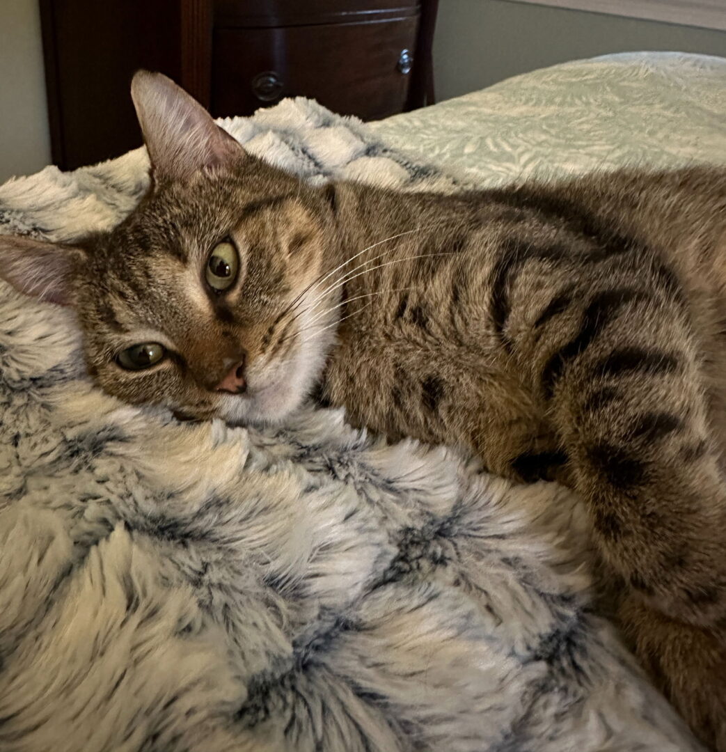 Dog-Friendly!! Hi, my name is Sprout! I am a female kitten, and my foster family found me in a vegetable garden. I am so friendly and love to get head rubs. I’m not frightened of much …. like loud noises. I love to eat and weigh about 6lbs. I like to play with toys that spin. I am so sweet and nice you won’t know I there…… I’m quiet but watchful…. I love to sit or lay near you to nap. I will also lay quietly in my kitten room…..Please ask to meet me! Love, Sprout. Sprout is about 6 months old as of Sept. 2024. She and the resident dog get along well, but she is not crazy about the resident male cats. Sprout is now playing in our Brandywine PetSmart. Please stop by to meet her! Please submit our no-obligation adoption application: https://forgottencats.org/adoption-application/. Thank you! (Foster: Donna M.)