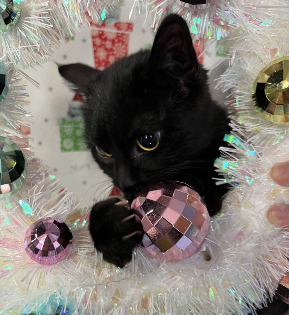 Spud is definitely a sour patch kid kittenTo start our adoption process, House of Mews Rescue asks that you please complete our online no-obligation adoption application, which is located on our website under the adopt tab at http://www.houseofmewsrescue.org/adopt.html Should our adoption coordinator feel your application is a good fit, a HOM volunteer will reach out to discuss it with you. Current on vaccinations, and have tested negative for both FIV (’Feline Immunodeficiency Virus’) and FeLV (Feline Leukemia). Spud is a 6-month-old, very crazy and spunky male kitten. He is mostlyblack with a small spot of white on his chest and a white tail tip. Hehas been in foster care since he was around 3 weeks of age and wasrescued from a colony of kittens in Euclid. He affectionately got hisname because when he was much smaller, he looked like a small potato!Spud is definitely a sour patch kid kitten. One minute, he’s playbiting and bouncing off the walls and the next minute he’s purring andcuddling up to your neck. He loves to play with all kinds of toys,especially a laser pointer and his catnip banana. Spud would do greatin a home with another playful cat/kitten or humans that love to play!When he winds down he does get cuddly and will give kisses.Spud has been around other kittens, adult cats, dogs, and an olderchild and does very well with everyone. He can sometimes get mouthywhile playing so we are working on redirecting him with his toys.Spud is an amazing little guy who can’t wait to find an active,playful forever home! Approx. birth date: 7/26/2024 Foster: BC