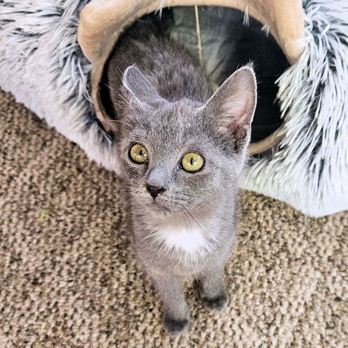 Starr is a male gray kitten, born October 24, 2024. He loves to play and play hard. He is sweet and loving. Starr loves to ride on your shoulder around the house. He is litterbox trained and hoping for his purrfect home!!! The adoption fee is $150. This covers the cost of spay/neuter, PVR, Rabies, flea, tick, ear mite and worm treatment. To adopt, you need to first fill out an application. Go to: https://rutherfordcountyhumanesociety.org/cat-adoption-application/ We are located in Western North Carolina. Optional transport is weekly. After your application is approved, we will contact you regarding cost and delivery if you so desire.