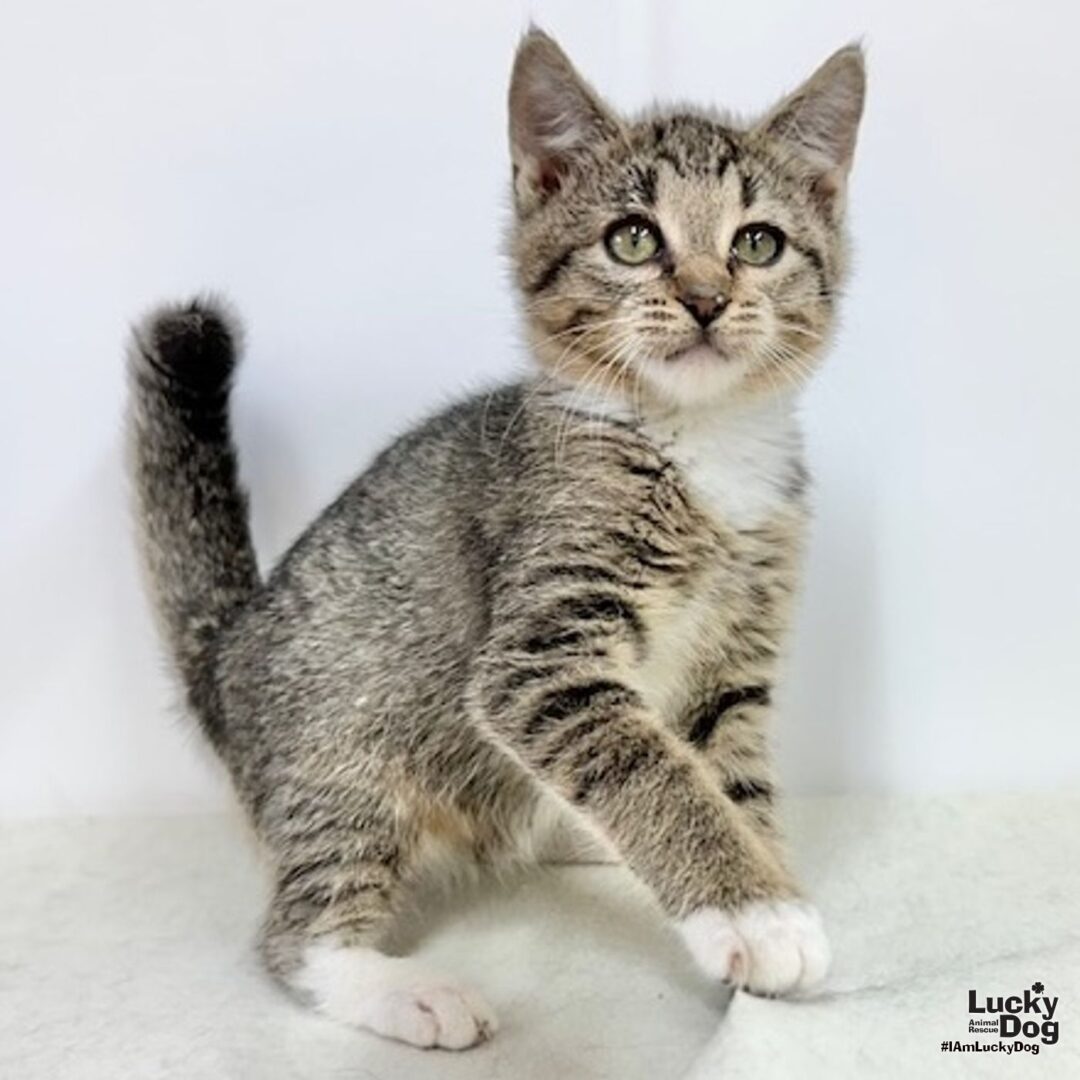 Please contact Lauren McCarty (laurenmc@luckydoganimalrescue.org) for more information about this pet.Sweet baby needs a forever home!STOKES NEEDS A FOREVER HOME! Name: Stokes Best Guess for Breed: Domestic Short Hair Age: 14 weeks 12/13 DOB: Estimated DOB 9/4/25 SEX: Male Weight: 3.22 lb 12/4 Coloring: Brown Tabby Type of Hair: Short Litter: Sim, Spencer, Stokes Gets Along With: Because of his young age, Stokes will likely get along with other cats, dogs and kids with an acclimation period. We’re happy to help with tips and tricks! Currently Living at: Shelter…coming to DC area soon I am Looking For: My loving forever family! Hi! I’m Stokes, and I am a cute little kitten! I won’t ask for much- just some love, cuddles and lots of toys so I can run and play and be my kitten self. What the Shelter Says About Me: Stokes is just stoked about life! Cross your eyes a little and do you see a baby bobcat? He’s one of three musketeers brothers. Stokes is a robust little tabby boy that is just waiting to fill your home with love and fun. He is totally ‘in your face’ social (fair warning) and extremely confident. He is also totally energetic – whether playing alone or with his sibling brothers. Stokes loves to be held and snuggled and is very well adjusted to humans handling him and other kitties inviting him to play. What my Foster Says About Me: Coming soon! Kitten Vetting Requirements: Your kitten may not be fully vaccinated upon adoption. You will be responsible for providing whatever remaining vaccines are needed to complete the kitten vaccine series. TO ADOPT: The adoption fee for adult cats is $200 ($350 for two cats adopted together). The adoption fee for a kitten (under 7 months old) is $220 ($380 for two kittens adopted together).If you are interested in adopting, please complete the Adoption Questionnaire online at bit.ly/adoptaluckycat. Lucky Dog Animal Rescue does our best to provide accurate information about the cats we have for adoption. That said, we cannot make any guarantees about age, breed or temperament. Thank you for contacting Lucky Dog Animal Rescue and helping to save a life! Please visit us online at www.luckydoganimalrescue.org . BE A FOSTER!!! Fosters make it possible for Lucky Dog Animal Rescue to save and care for homeless and abandoned dogs! To learn about fostering, please contact fostering@luckydoganimalrescue.org BE A SPONSOR!!!! Sponsors help Lucky Dog support the many dogs we save. To learn more about sponsorship, please contact info@luckydoganimalrescue.org !