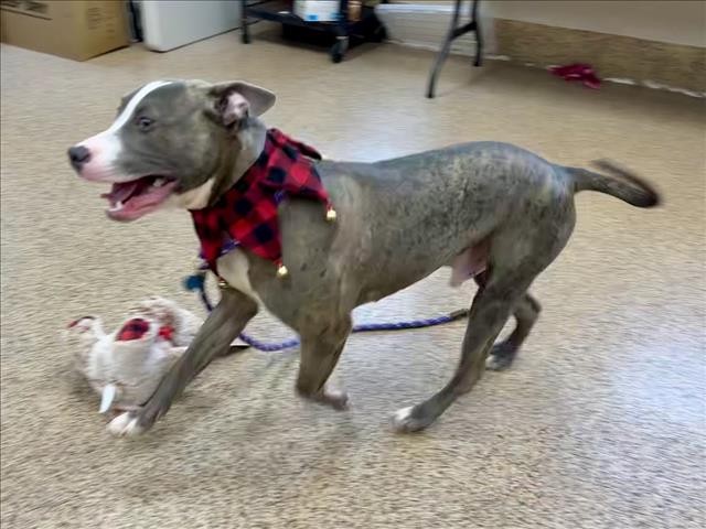 Storm is a blur of activity AND a blur of color! This heart-nosed sweetie boasts a coat of both brindle and merle in addition to his stylish white blaze and toes. Storm will need some support learning how a dog of his size should behave in various situations but we anticipate he will take well to positive reinforcement training since he loves positive feedback so much.OTHER PETS: Storm is an outgoing, playful dog who attempts to engage all dogs he meets in play. He is rough and rowdy, and sometimes verges into rude behaviors with smaller dogs. His best match would be with a dog of similar size, play style & temperament. [Likely – Similar Size & Temperment – (Must Meet First)] OWNER EXPERIENCE: Someone who has previously owned a dog before would be less overwhelmed by Storm’s mischevious behavior – he will jump on and off tables and sometimes forgets that he knows how to walk with a loose leash and begins pulling. [Some Experience] KIDS: Storm is uncomfortable with some handling, wary of new people (but warms up quickly) and is a strong, rambunctious dog. His best match would be with a household that does not have any pre-teen or younger humans.[13+ (Must Meet First)]ACTIVITY LEVEL: Storm is a dog who will need multiple daily walks or a combination of walks and other engaging activities & mental enrichment to ensure his needs are met. Positive reinforcement training is a great stepping stone that will open doors for other activities like dog sports (agility, flyball, etc) and becoming a human adventure companion. Supervised outdoor playtime and puzzle toys are also good options to keep Storm mentally and physically engaged. [Good Walking Buddy / Olympic Athlete]VETERINARY CARE: [Routine] GROOMING: [Minimal] LEVEL OF TRAINING NEEDED: Positive reinforcement training will help Storm bond with his new owner as well as help him learn important skills. Further positive reinforcement training will enrich Storm’s life and give him the opportunity to participate in various activities. [Minimal]