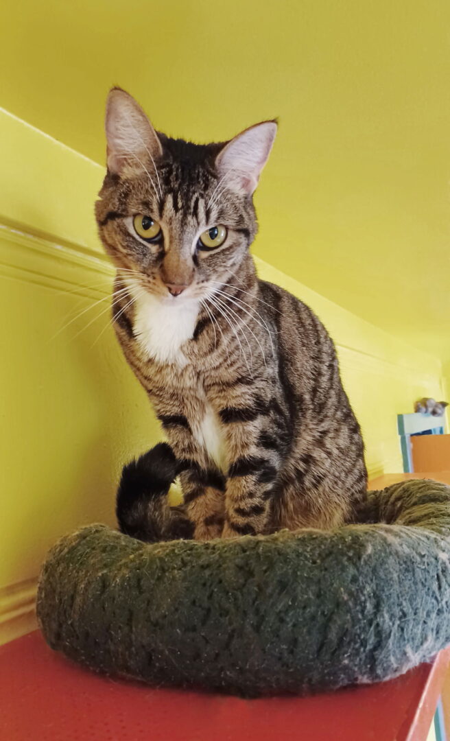 Storm is an engaging and charming young cat. She loves toys and interactive playtime. She is talkative and friendly. She loves to be a lap cat and gives gentle head bumps. She would prefer to go to a home with another cat or to be adopted with her friend, Chickadee . Storm and Chickadee grew up together as kittens. They make a nice pair for anyone wanting to adopt two cats. Storm gets along with various cat personalities so she would do well with most cats in a household. Storm's estimated birth date is mid-October of 2022. Kitty Bio #1940AP-St. If you're interested in adopting this or another of our cats, please fill out our adoption questionnaire at icraeastbay.org/adopt/how-to/.