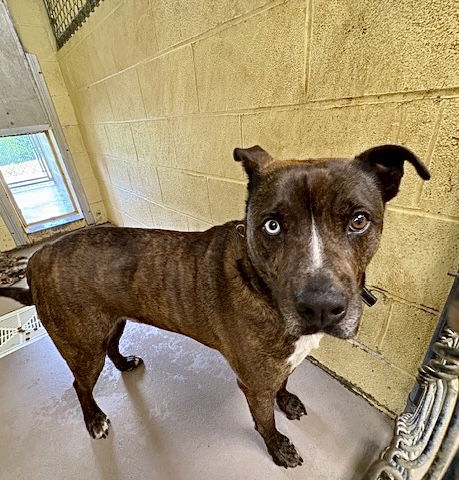 Here is a large dog for those of you who are looking for a friend you can lean on and put your arms around on those cooler nights. His name is STUD MUFFIN! This gorgeous fellow is listed at 3 to 4 years of age and he weighed a whopping 75 pounds at Intake in mid May 2025. Staff has listed him as a mixture of Hound and Bully. His markings are brindle and white. Thankfully, he was already neutered upon arrival and that means that he can go home the same day that he is adopted! Serious adopters are encouraged to CALL the shelter to schedule an adoption appointment. Staff can explain the adoption procedures and fees when you call. The shelter does require EXACT change in the form of cash or a check. The shelter is UNABLE to accept credit or debit. So, please go prepared! That includes taking a dog collar and leash with you to the appointment in case you do decide to adopt STUD MUFFIN or one of the other spayed or neutered dogs currently at the shelter. Even better, take a dog crate with you to that appointment. No animal should be allowed to run freely in any vehicle. Especially an animal that you have just adopted! Safety first!