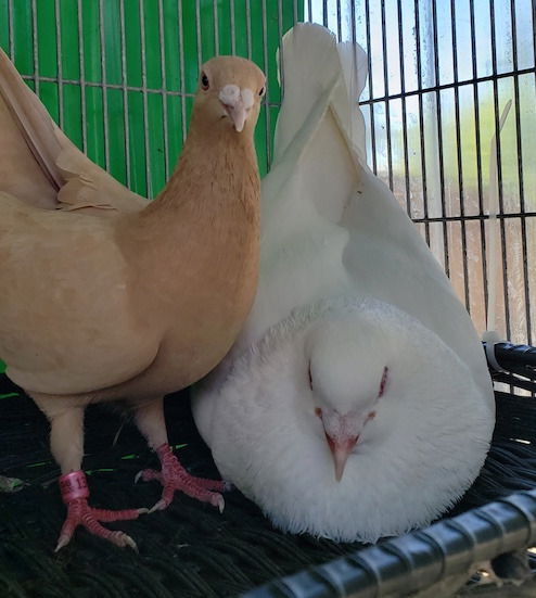 Update 6/2/21: Sugar has married her gentle, giant King pigeon friend, Cello. We are very happy for them!Sugar is a beautiful little Roller pigeon with tiny feet & a racer’s face. S/he was lost & grounded with a strained wing when rescued & taken to San Jose Animal Care Shelter on 5/17. Though banded, no one responded to the shelter’s efforts to get her claimed & we rescued her on 5/22. Sugar was very tense & fearful when picked up but cheered as soon as she joined other rescued pigeons. She immediately took a bath & had a nice soak with her new giant King pigeon friend. Her sore wing is recovering & she’s flapping & flying in the aviary now.Please apply to adopt http://www.pigeonrescue.org/birds/apply-to-foster-or-adopt/