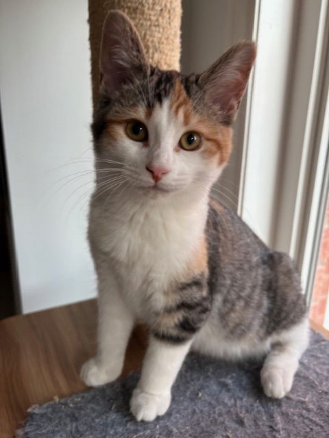 DOB: November 27, 2024 As her name implies, Sugarplum is a sweet delight! She is a pretty cat with a spectacular mix of calico and tabby markings, and gorgeous big eyes. You will enjoy watching Sugarplum attack toys with kitten enthusiasm—and anything she finds laying around the house usually has the potential to become her toy. She is very social and delights in being in the company people of all ages—adults and children—and she always welcomes the companionship other cats. Sugarplum has taken on the role as her foster parent's office assistant, and she will regularly show up for work in the home office. She isn’t a particularly productive coworker because she inevitably falls asleep, but she is lovely company. Sugarplum is outgoing, friendly, enjoys attention and a wonderful snuggle bug. She is an equal-opportunity cuddler and she will alternate her snuggle time between you and her and bestie, Coal. The siblings are very bonded and must be adopted togetherAdoption applications are available at http://www.forgottenones.ca/adoptions/. Please email the completed form to contact@forgottenones.ca. Adoption fees are $250.00 for adult cats (one year and older), $300.00 for kittens, and $175.00 for senior cats (10+ years old). The fee includes: veterinary health check, spay/neuter surgery, microchip, testing for Feline Leukemia and FIV, vaccinations, flea and ear mite treatments NOTE: Young kittens may not have had their spay/neuter surgery and final vaccinations at the time of their bio posting, but they are included in the adoption fee.