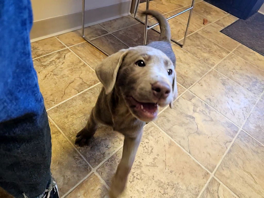 This sweet little puppy was born on 9/2/25 and is ready to find her forever family. She’s a sweet little (for noe) silver lab that loves people, kids, and everything fun.