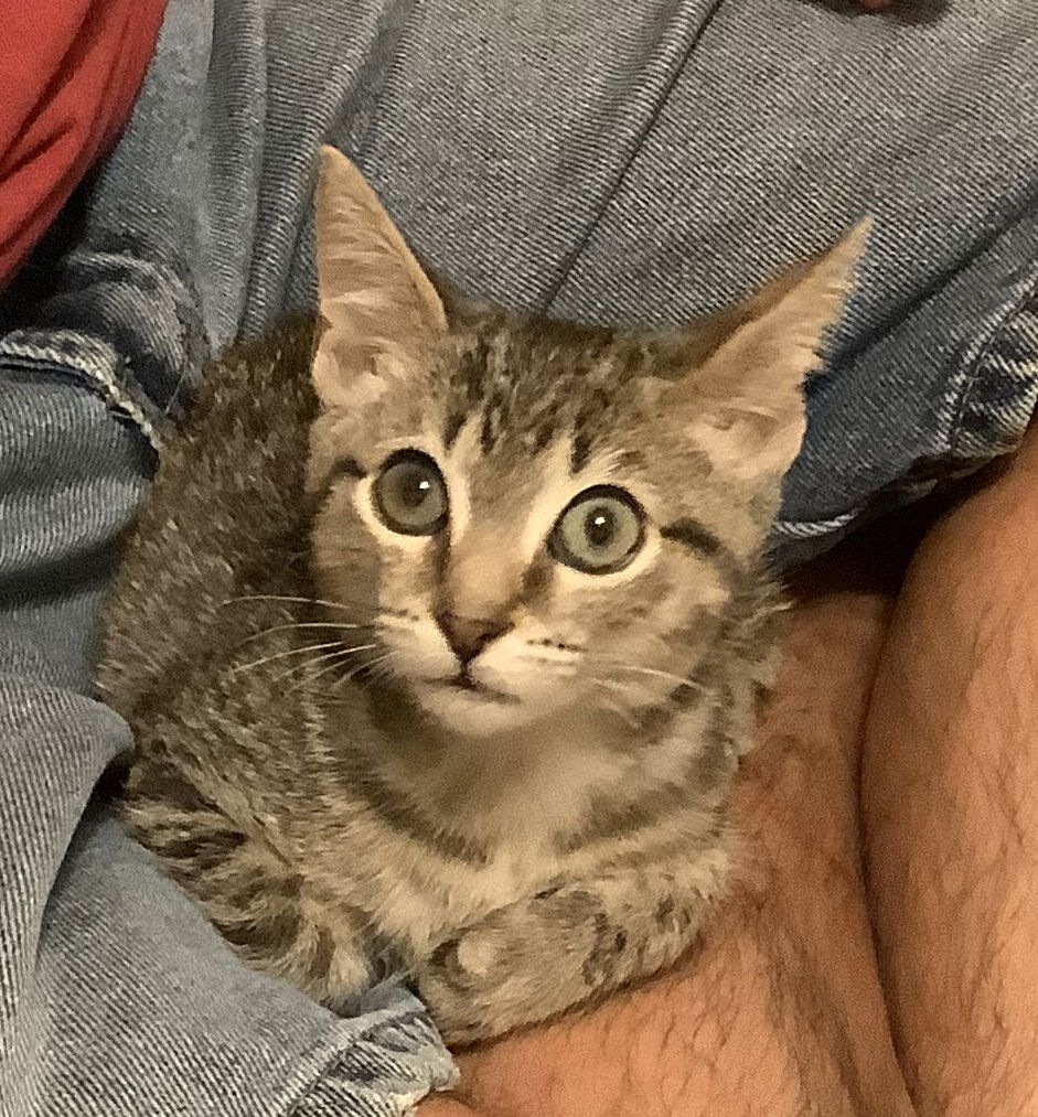 Hello my name is Sunny. I am a 5 month old, 3.12 pound little boy as of November 1st. I am small for my age as I started out with some bowel trouble. I found a food though that healed me all up and now I can eat any old cat food Yum! Because of this though they think I will be a small kitty even all grown up. I love to play with string toys and any ball on a track toy. I also love to sit in your lap. Just see the pictures of me on my daddy’s lap. Mom says though I am the bestest ever good boy as I do not climb or bother the Christmas tree. I just like to lay under it and get my picture taken! I also liked having my picture taken as a bee on Halloween! Look how cute I was! I loved meeting all the little kids at mom’s preschool. So I love little kids. At home now I have 3 foster cat siblings I love as well. I can go home as a single kitty if you are home or work from home, but I would also really love another cat in the home too. Maybe a dog would be okay as I am easy going but I have just never met one. If I seem like a good fit for your family please fill out a no obligation adoption application and soon you can take pictures of me under your tree. Sunny is playing with his foster family. Please submit our no-obligation application for a meet and greet or to adopt: https://forgottencats.org/adoption-application/. Thank you! (Foster: Amanda M-A . ).