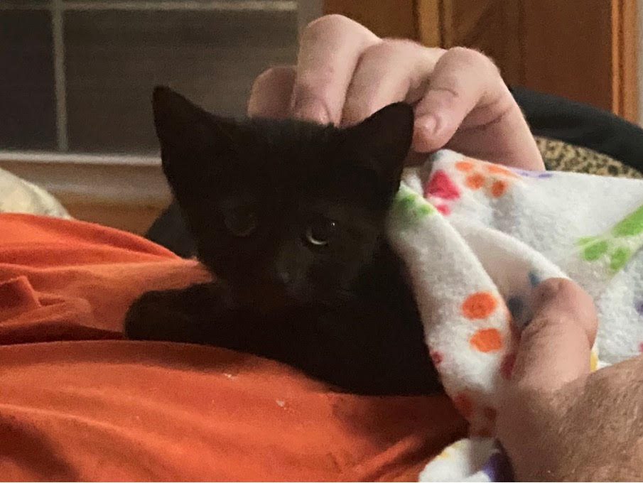 I am scheduled to be at the adoption event in the Brandywine PetSmart Nov. 22-24. Please ask to meet me. Thank you! Oh! my foster brother Milo will be joining me. Cuddly and Playful!! Please meet baby Sutty! Sutty loves to climb, run, and play. She watches every move we make and always wants to be right next to us. She loves to look out the windows. She is very cuddly and playful with us, and especially with my adult cat. She also loves to play by herself with toys. First picture is of her lying on Richie’s chest-purring away. Sutty always comes out to greet us. She has no fear. She does run or sometimes hide from me, but it is like she is playing a game of hide and seek. If I do not get her, she runs out, and then runs away for me to chase her. Sutty may need tender loving care when she first comes home to you but will be your best friend very quickly. Sutty’s fur looks to be solid black, but her fur has very faint stripes. Sutty is about 3 months old as of Oct. 2024 and is playing with her foster family. Sutty really needs to have a feline companion. Please submit our no-obligation adoption application for a meet and greet or to adopt: https://forgottencats.org/adoption-application/ . Thank you! (Foster: Donna A.)