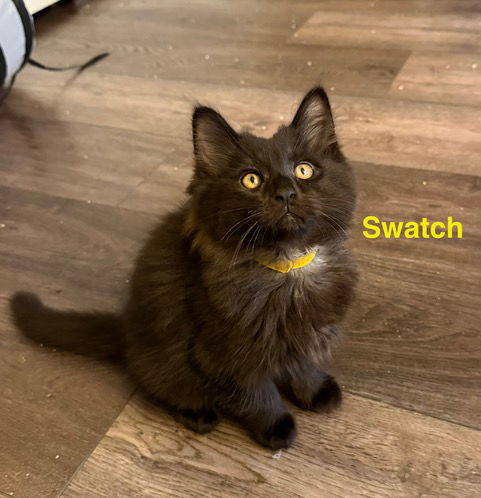I am currently available for adoption from my foster home. If you’re interested in adopting me, fill out an application on our website www.carmaoc.org My name is Swatch and I am a handsome, fluffy, and friendly male black kitten. My siblings and I are everything you would want in a kitten. We are very sociable, love to cuddle, and incredibly energetic and playful! We love ALL toys – balls, springs, wands, and tunnels. After we nap at the top of our cat tree, we are ready to go another round of wrestling and chasing each other! My adoption fee is $175. That includes spay/neuter, microchip, FIV/FeLV combo test, current vaccines and health check.