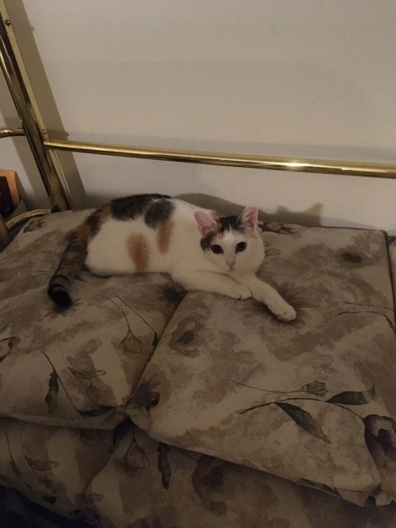 Sweet Pea was brought to me with her kids Charlene, Buttercup, Tortalena, Pooh Bear and Machado. She had a broken left front leg. It is healing and she is walking on it. She likes to lay and be comfortable and look out windows. She is a beautiful calico. She is fully vetted, spayed, Neval at 216-832-1106 or huey155@roadrunner.com. Please provide phone number in contact. No texts please. Born summer 2019. Adoption fee is $85.00 There is a $25 discount for adopting any bonded pair.