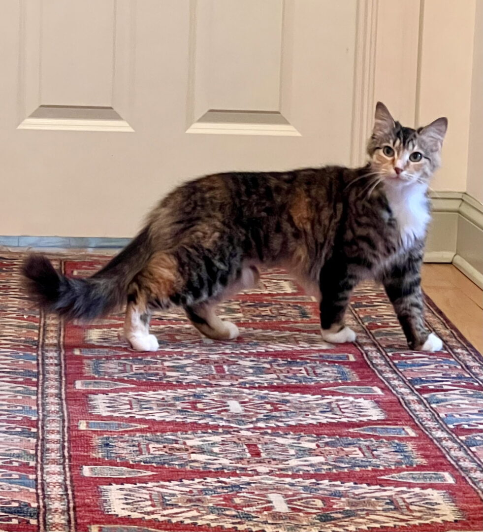 Meet gorgeous young Sybil, so unusual in her calico coloring, bold tabby stripes and white tuxedo! You’ll also be drawn to her green eyes, bushy tail and four dainty white paws. As if that weren’t special enough, Sybil has unique face markings- orange tabby stripes on the bottom and brown/black on the top, divided by flashy black eyeliner. Take a close look at her photos. And be sure to watch Sybil’s video as she enjoys pets from a human admirer. Sybil is very interested in her people. She eagerly greets us when we enter her room, standing up on her hind legs as she stretches for pets. She makes strong eye contact, purrs all the time and is happiest when spending time with us humans. Sybil’s signature move is to tuck her head into your hand and prance around for your attention. Sybil does have a sassy side at this point, but she is quickly becoming relaxed and snuggly with her foster family. Sybil welcomes human friends, both familiar and new. Please check out her video: https://www.youtube.com/shorts/eMfB9YvVX34 . Would you like to meet supermodel Sybil? Ask to speak with her foster mom to learn more about her! Please submit our no-obligation Adoption Application for a meet and greet or to adopt: https://forgottencats.org/adoption-application/. Not ready to adopt? Please consider fostering: https://forgottencats.org/foster-a-cat/. Thank you! (Foster: Laurie B)