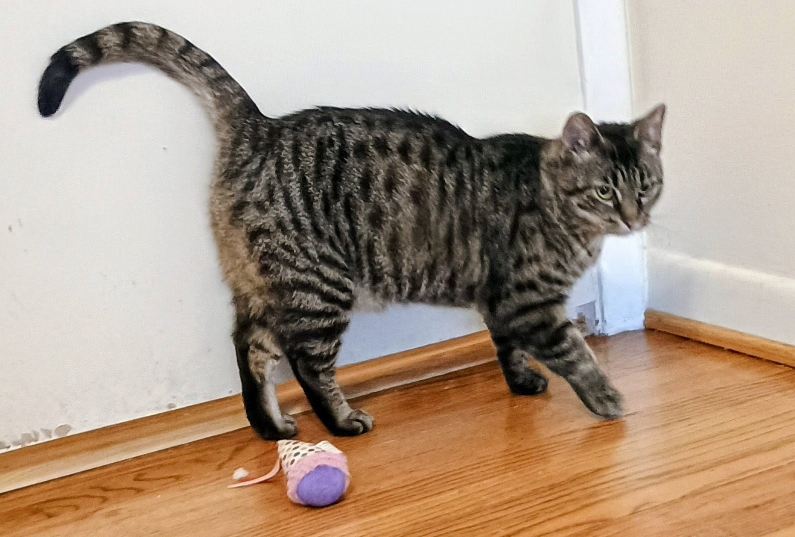 See Tabitha’s HomepageGo to our official websiteYou can fill out an adoption application online on our official website.Tabitha is a beautiful tabby with black markings on a brown fur. She is friendly and loves to be pet. She will swish around you and bow her head for you to pet, she will then flop on the floor in front of you. Tabitha is a more laid back cat, that doesn’t chew up things or knock them off of surfaces, just a chill kind of kitty. She also likes playing with toys and looking out the window. Tabitha will make a great companion and family member. Happy Days Dog & Cat Rescue requires a Spay/Neuter Contract by the adopter if puppies and kittens in our care are too young for sterilization at the time of adoption. This is a form the adopter signs at the time of adoption, confirming that they will get the pet spayed/neutered by a certain date. HDDCR holds a deposit [$50 for dogs, $25 for cats] in addition to the adoption fee until we receive proof from a veterinarian that the dog or cat was spayed/neutered by the date stipulated on the Spay/Neuter Contract. The deposit will be refunded to the adopter if spay/neuter was done according to the Spay/Neuter Contract signed by the adopter. Happy Days Dog and Cat Rescue microchips all dogs and cats before adoption. Microchips are implanted between the shoulder blades and are another form of identification should the animal get lost. The microchips are registered to Happy Days Dog and Cat Rescue. The microchip is transferred to the adopter once the adoption is complete. The adopter is responsible for a one-time $15 microchip enrollment fee, paid at the time of adoption. Microchips are enrolled with AKC Reunite. Dogs and Cats still need to have collar with tags should they get lost.